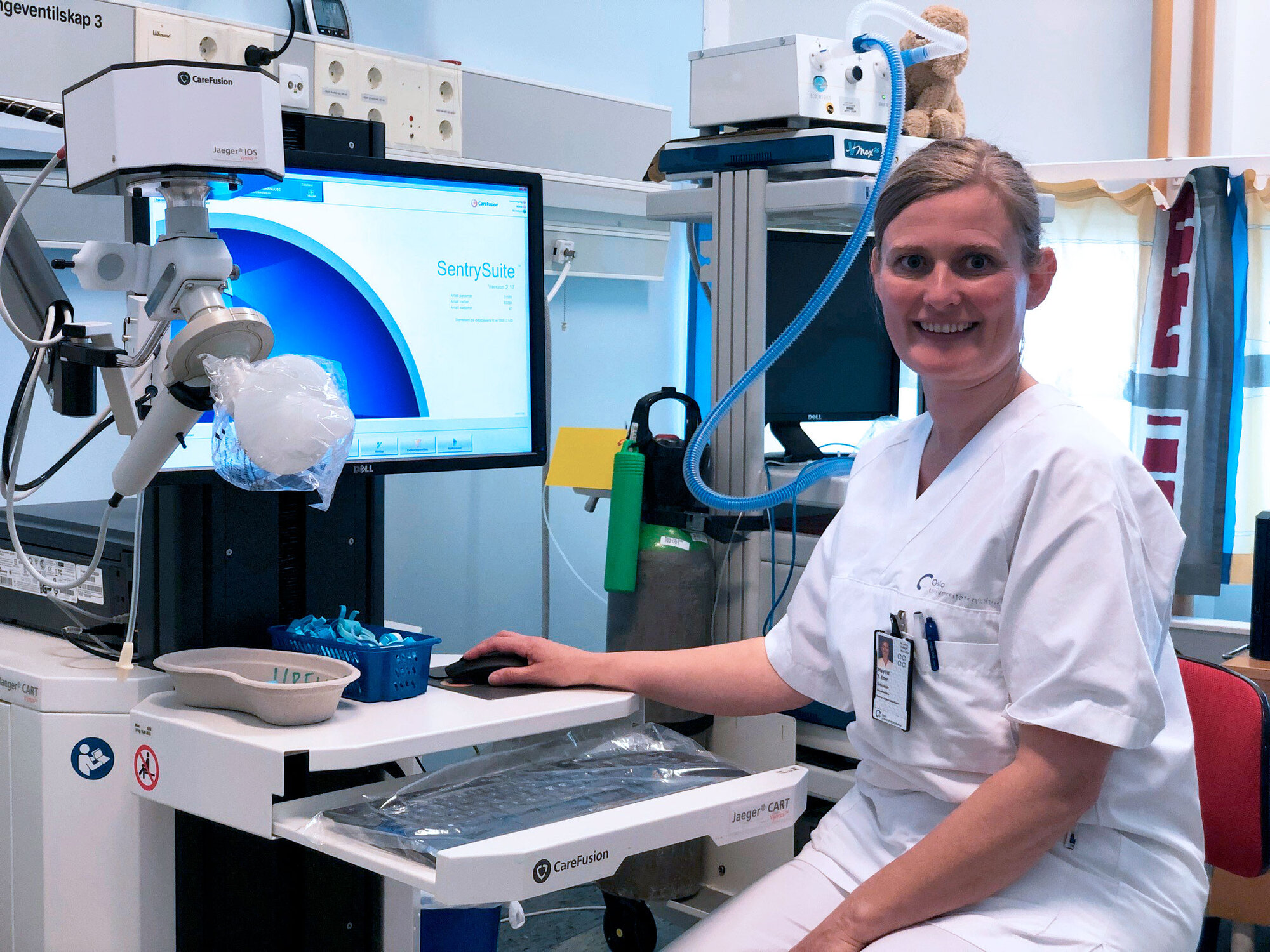 En vanlig dag hos oss starter med at vi klargjør laben og kalibrerer lungefunksjonsutstyr. Vi har ofte 1–2 leger som har konsultasjoner samtidig. Vi følger med på når pasienten kommer, tar høyde og vekt og sjekker inhalasjonsteknikk når det er aktuelt. Det er kjent at mange bruker sine inhalasjonsmedisiner feil.