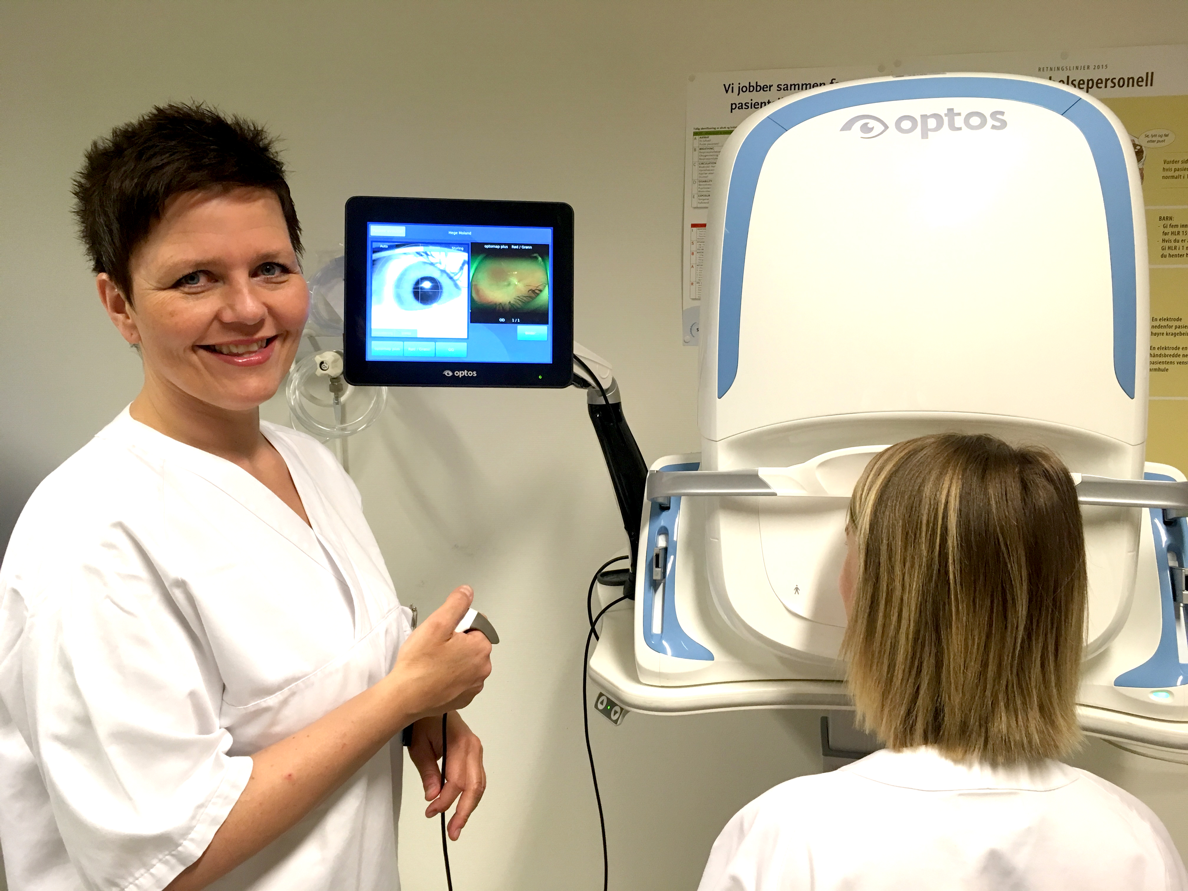 I løpet av en dag kan vi ha 30–40 pasienter inne til behandling for makulaødem – en ny pasient hvert tiende minutt. Sprøyte i øyet, vaske og informere. Dette går i ett, så vi jobber som regel halve dagen med denne oppgaven. Den andre delen av dagen går til synstester og netthinnefotografering. Vi tester synet til pasienter som skal inn til legekontroll.