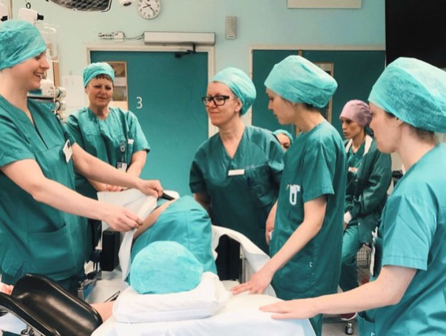 Bildet viser operasjonssykepleiere, noen med gravide mager.