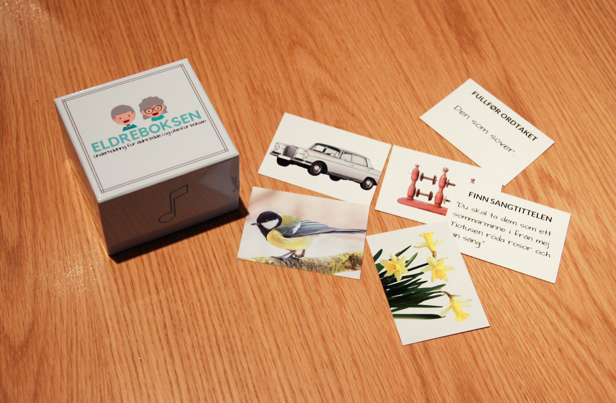 Og nettopp dette ønsket de å bygge videre på. Eldreboksen består av spørsmålskort der man blant annet blir bedt om å fullføre ordtak og huske sangtitler.