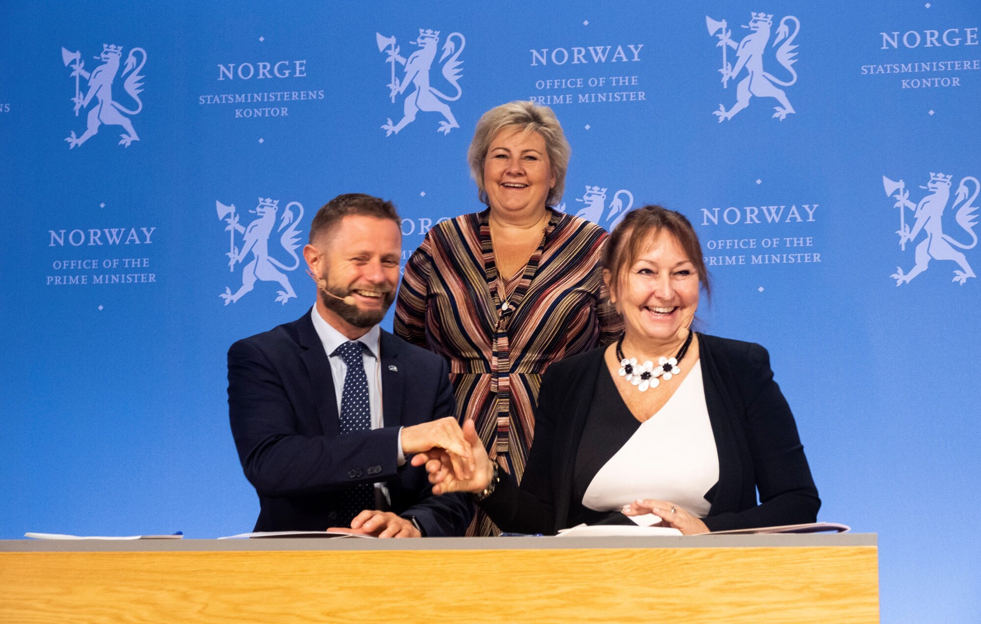 – Jeg er veldig glad for at vi har blitt enige med KS om å etablere helsefellesskapene. Vi skal nå signere avtalen som sikrer en mer sammenhengende tjeneste, til det beste for pasienten. Når en signerer denne type ekteskapsinngåelse, som dette her jo er, så er det veldig lurt at vi har et vitne, så jeg håper statsministeren kan komme opp mens vi signerer.