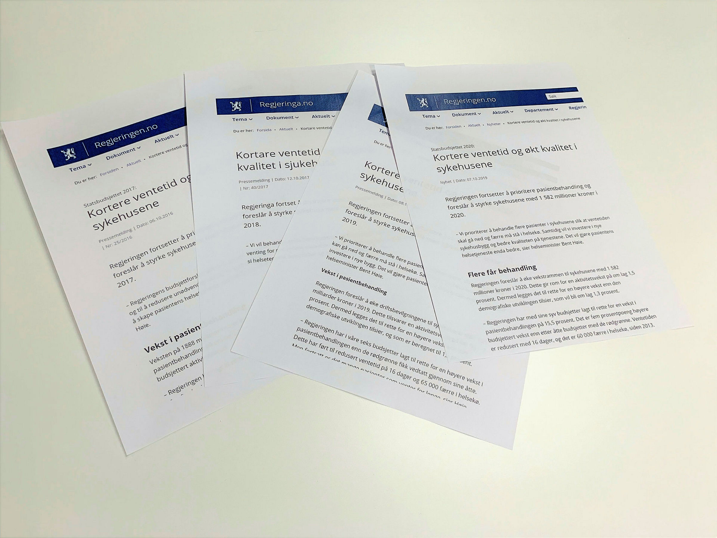 Tittelen fra de siste fire årene – 2016, 2017, 2018 og 2019 – er identisk: Hvert år har regjeringen gått ut med budskapet «Kortere ventetid og økt kvalitet i sykehusene» – om enn i nynorsk versjon i 2017.