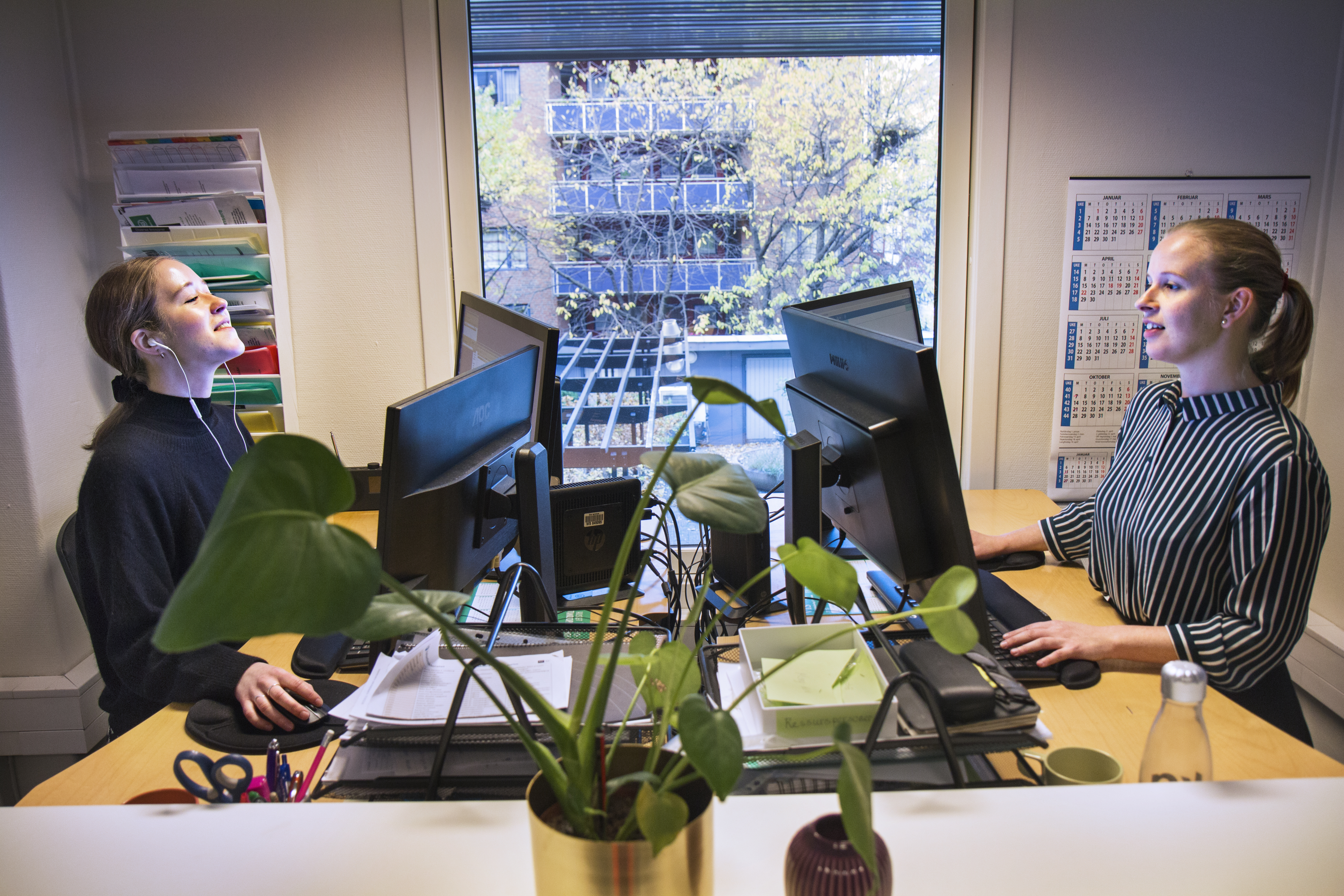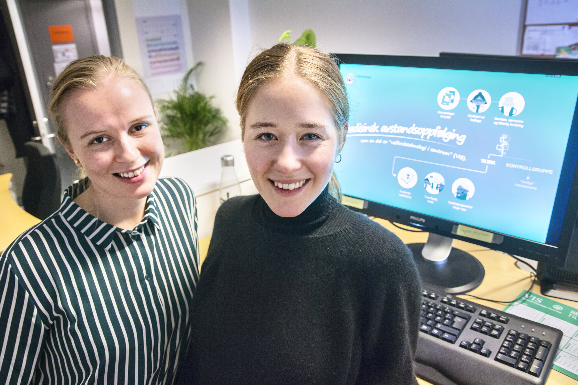 Foran hver sine to svære pc-skjermer utøver hun og Kaja Bast Sørsdal sykepleie.