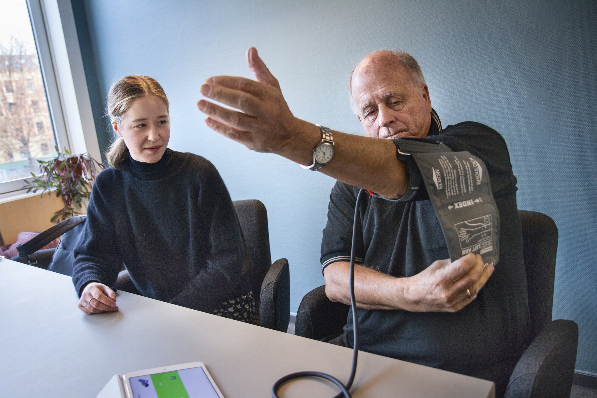 Samboeren hans har også avstandsoppfølging. Skarstrøm hjelper henne med å måle blodtrykket.