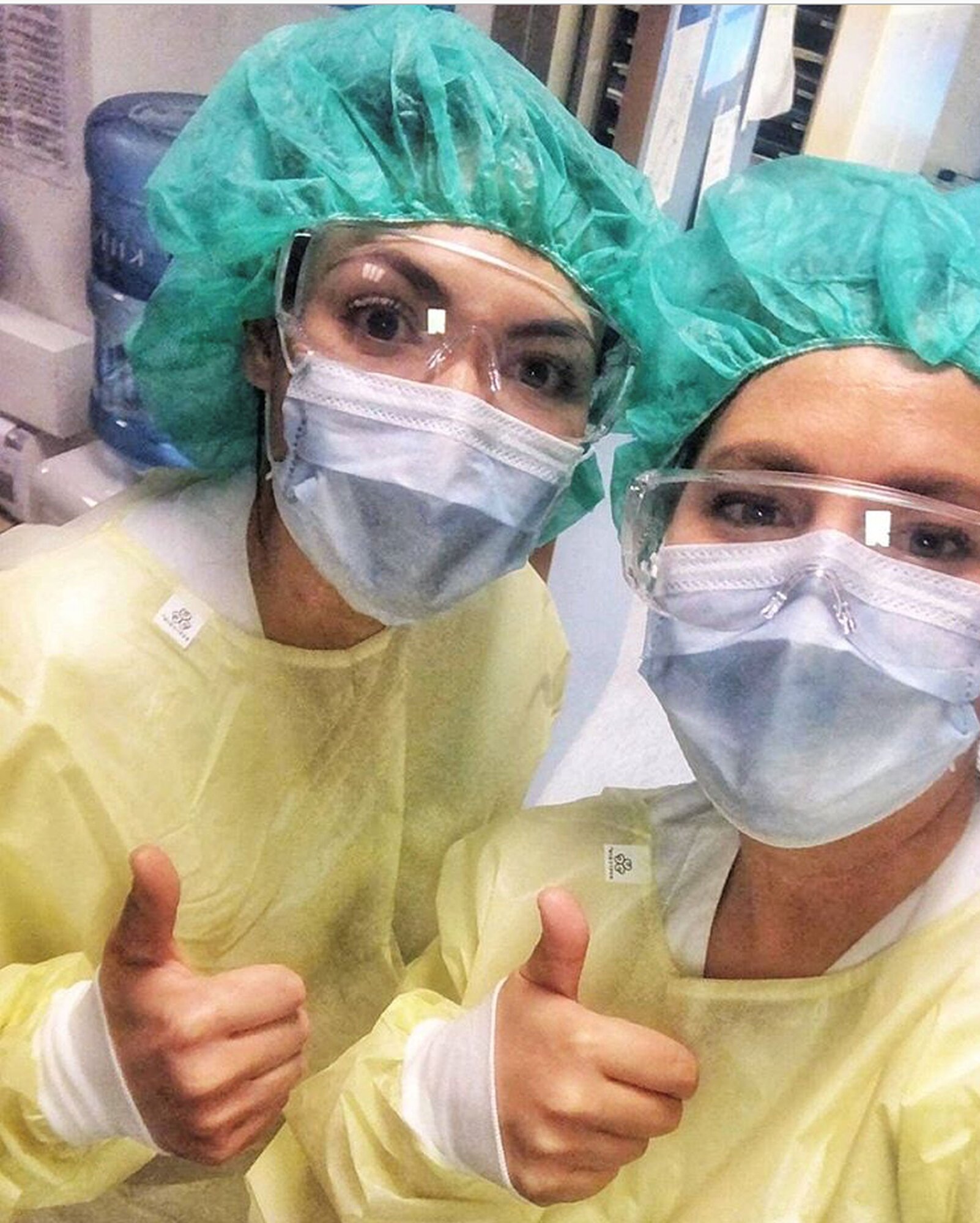 Nettopp gått av nattevakt preget av smitteutstyr på hele natten. Vi gjør det beste ut av det, og holder humøret oppe.