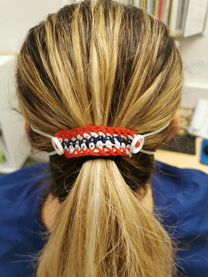 Resultatet ble en munnbindholder, sirlig heklet og med en knapp i hver ende. Festet i håret, kan strikken fra munnbindet hektes i knappene, i stedet for bak ørene.