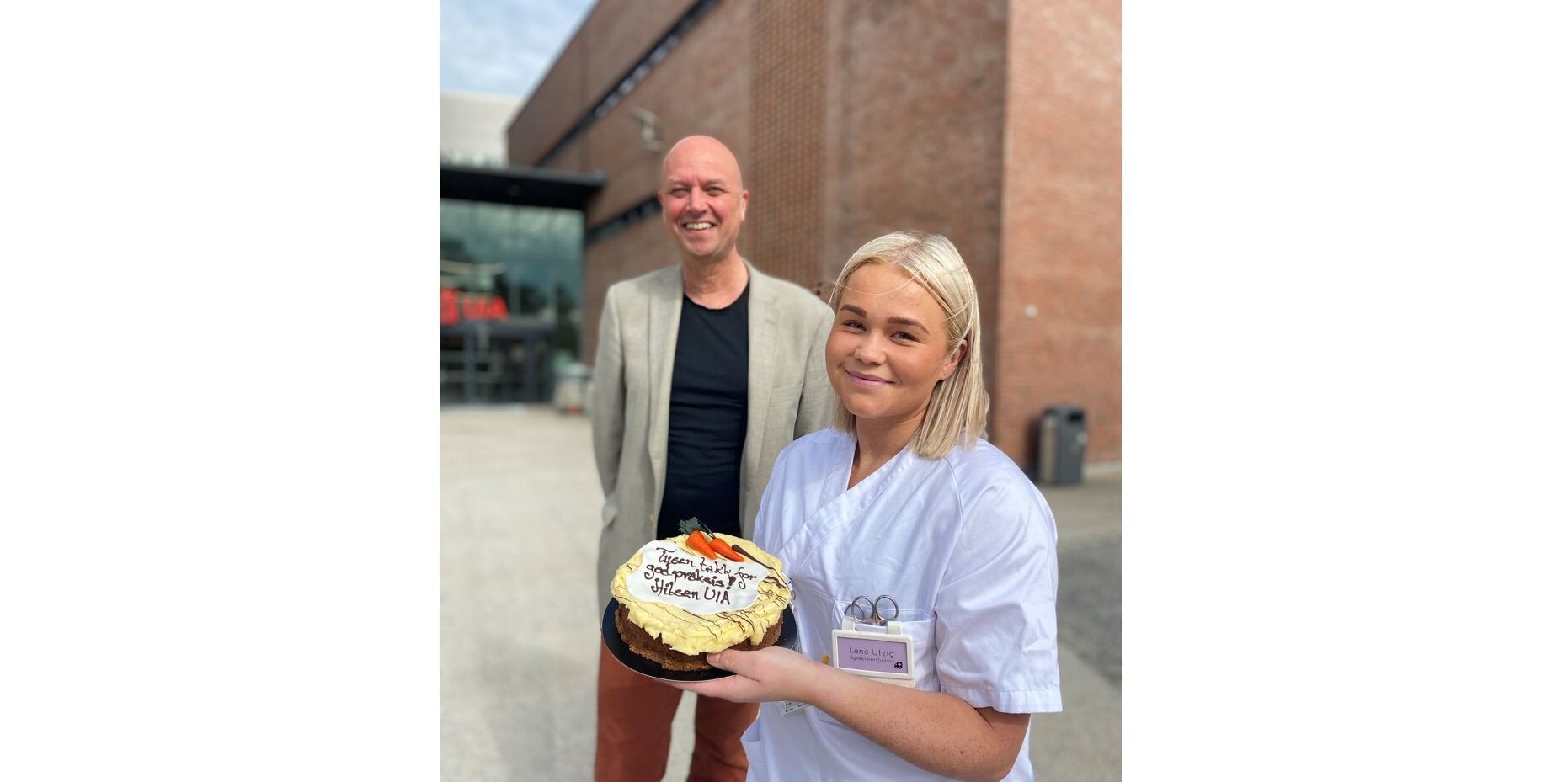 Universitetet tar imidlertid ikke selv æren for dette. I dag har 193 poster og avdelinger ved sykehus og ute i kommunehelsetjenesten fått kake-takk. Bakere over hele Sørlandet har i dag, 11. juni, kjørt ut 193 sjokolade- og gulrotkaker ut til alle avdelinger og institusjoner som har studenter i praksis.