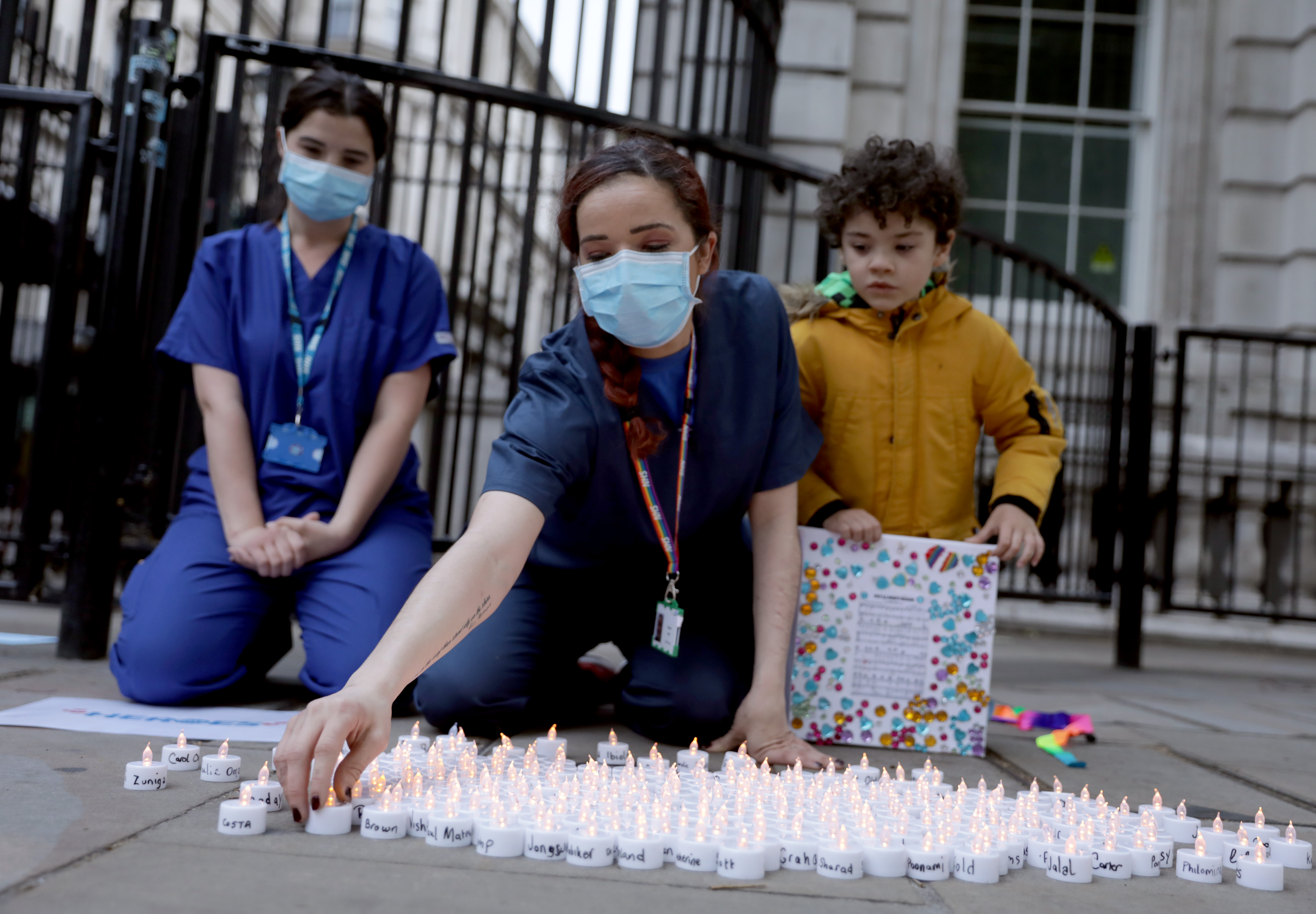 I London (bildet) 11. juni satte to sykepleiere seg utenfor statsministerboligen i Downing Street under en våkenatt, med lys med navnet på døde helsearbeidere. Dette er bare ett eksempel på hvordan britene ønsker å minnes helsearbeidere som har omkommet etter å ha stått i travle vakter for å hjelpe covid-19-syke pasienter.