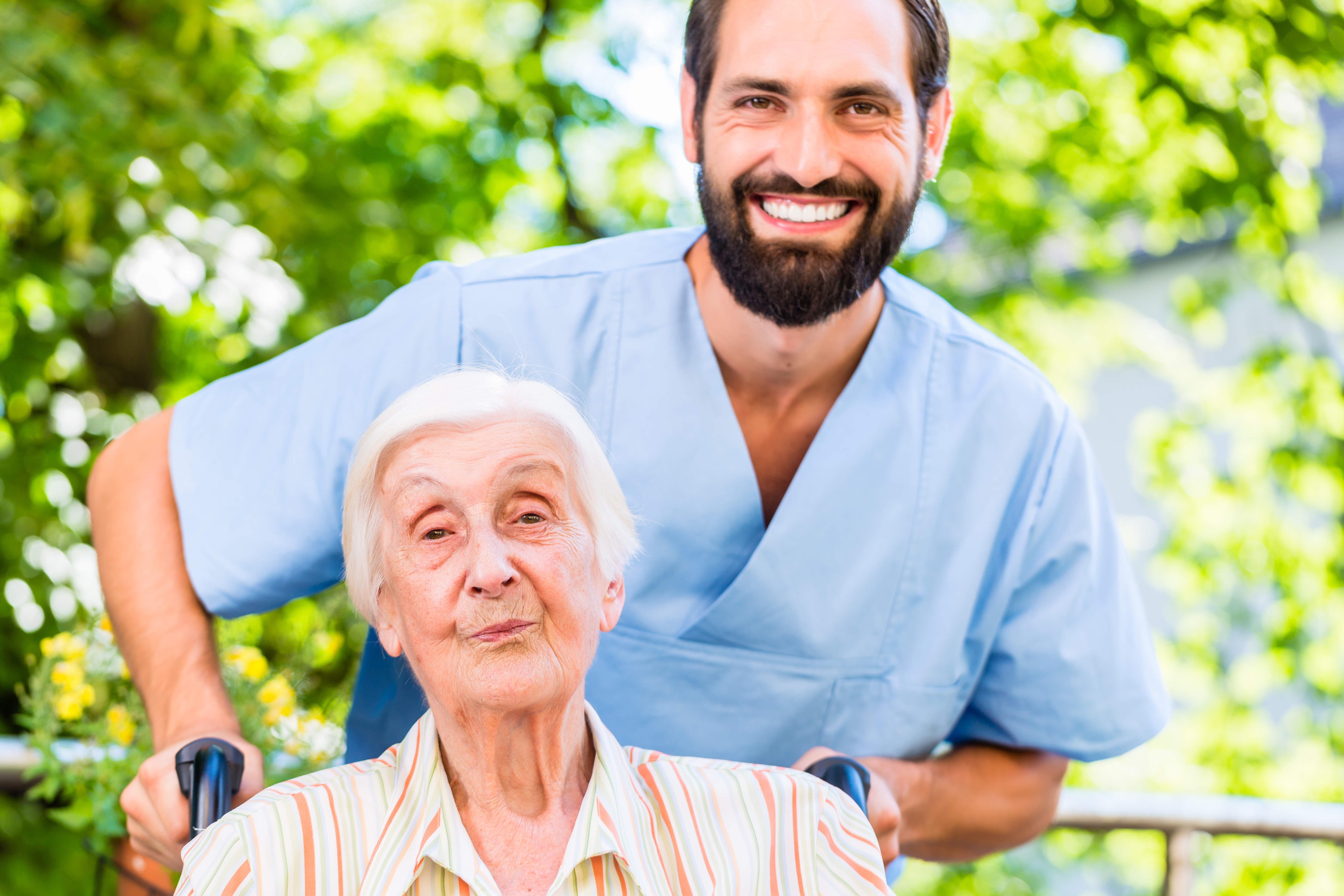 Bildet viser en eldre kvinne i en rullestol med en smilende pleier i bakgrunnen