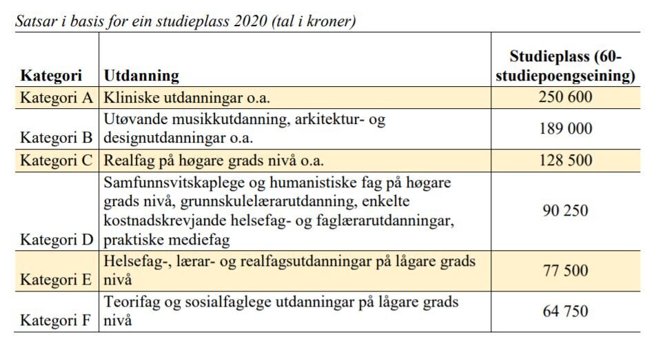 Det er Kunnskapsdepartementet som administrerer ordningen. I Orientering om statsbudsjettet for universitet og høyskoler har de redegjort for hvilke utdanninger som er lagt i de forskjellige finansieringskategoriene. (s. 41–42)