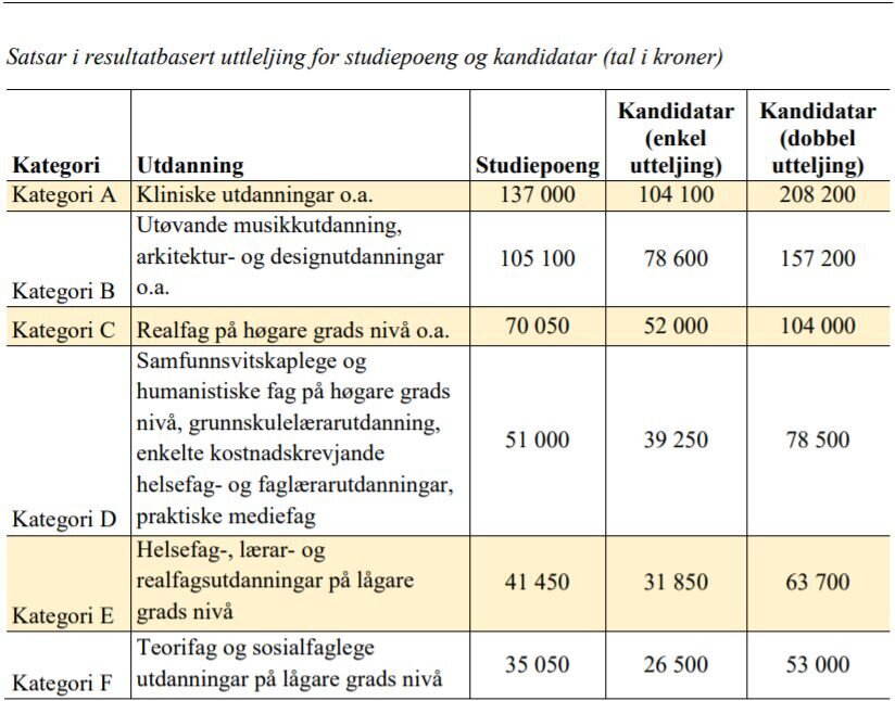 Sykepleien får opplyst fra Kunnskapsdepartementet at satsene i resultatbasert uttelling viser hvor mye utdanningsinstitusjonen får tildelt når studentene avlegger en studiepoengenhet (60 studiepoeng), en grad (dobbel sats dersom graden er integrert, minst 5-årig), en doktorgrad, eller et utvekslingsopphold. (se tabell under).