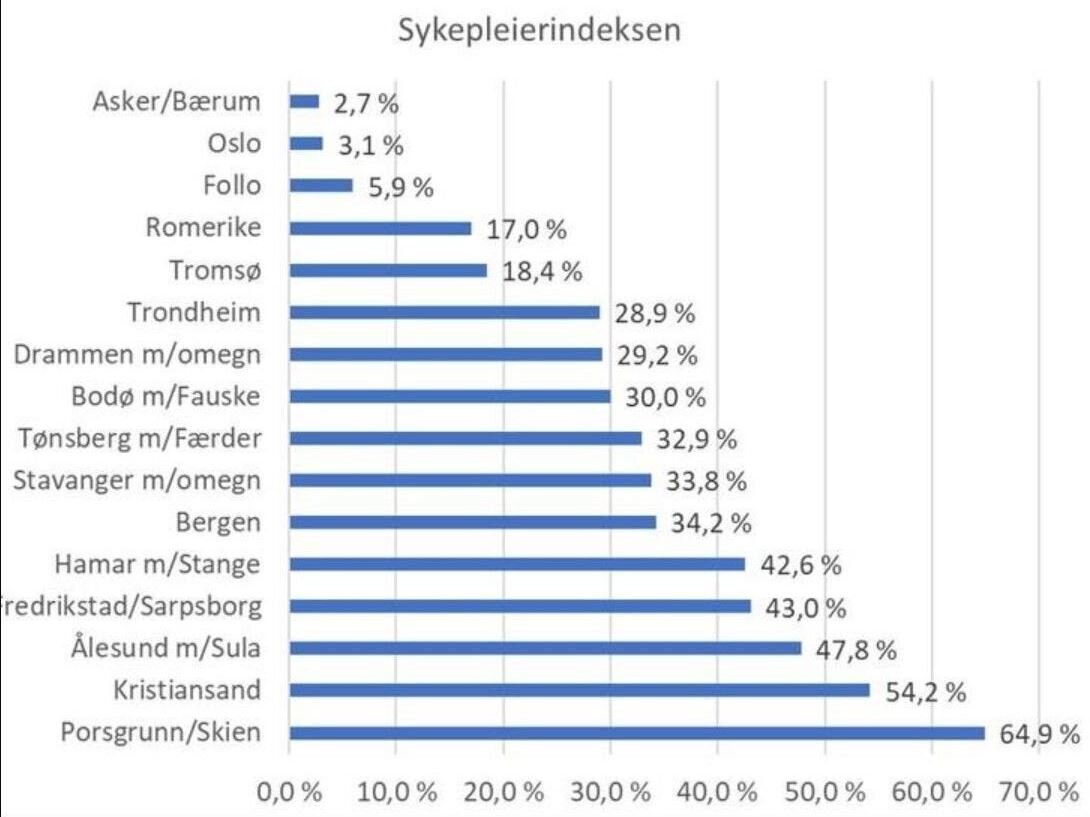 I Trondheim kan en sykepleier kjøpe 28,9 prosent av boligene, i Stavanger 33,8 prosent, i Bergen 34,2 prosent, og i Skien/Porsgrunn 64,9 prosent.