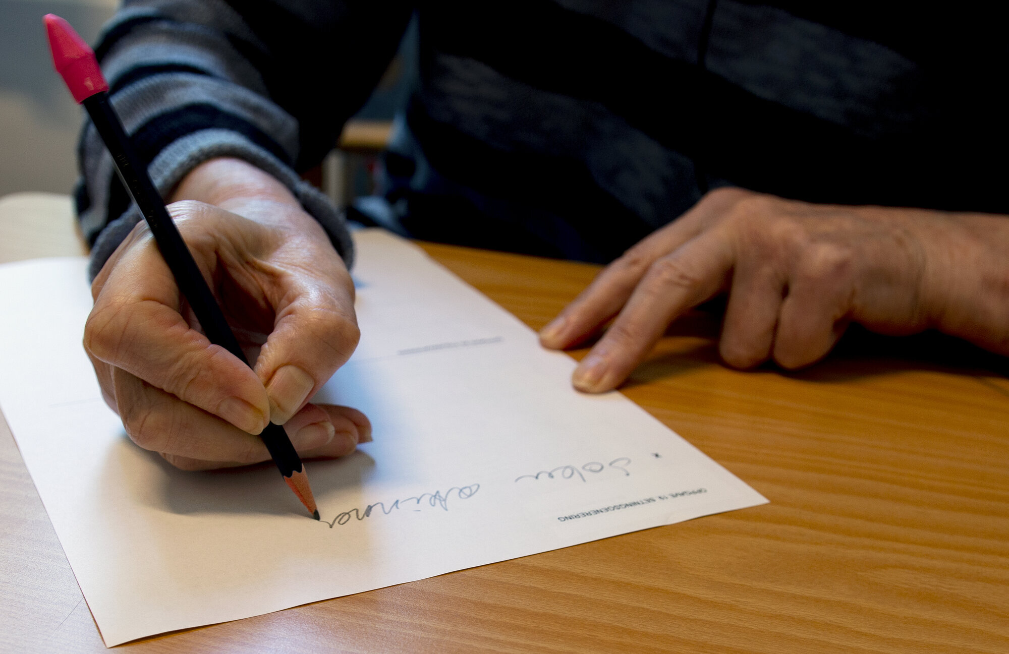 Dette er en uvant øvelse, og hun visker ut noen streker før hun sier seg fornøyd. Klokketesten går lett, viserne plasseres på ti minutter over elleve, og arket leveres tilbake.