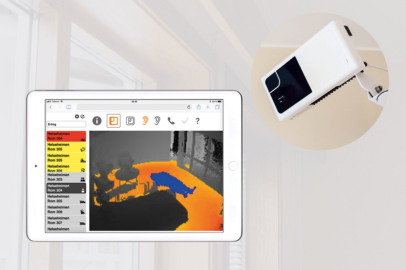Boksen på veggen er utstyrt med 3D-sensor og en datamaskin som analyserer hva som skjer i rommet. Den skal kunne se forskjell på armer og bein – mennesker og møbler.