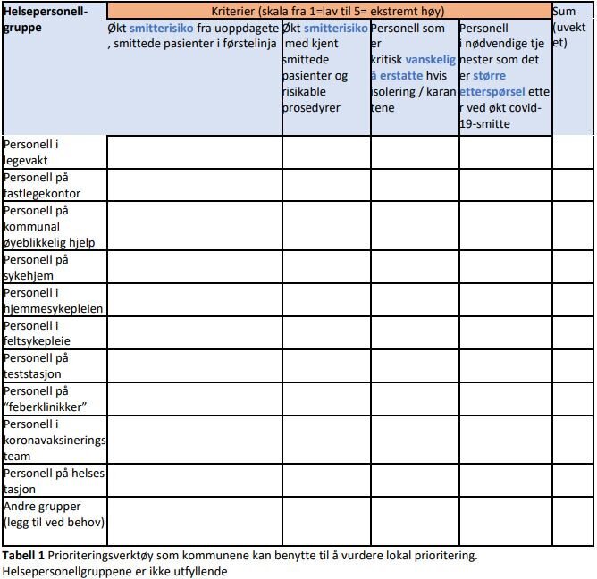 Det er helseforetakene og kommunene selv som vurderer hvem som skal få vaksinen først. Men FHI krever at følgende kriterier anvendes som beslutningsgrunnlag: