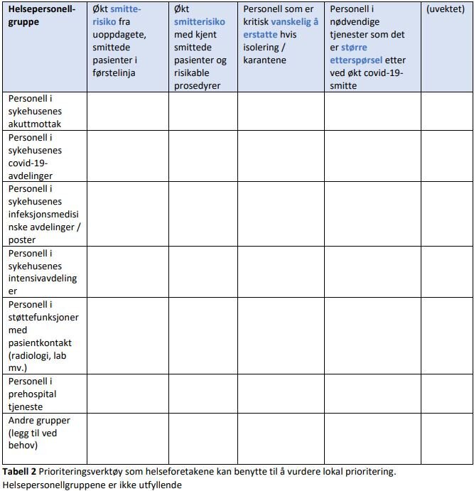 Tabellene under viser hvordan kommuner (tabell 1) og helseforetak (tabell 2) skal kunne prioritere mellom personell i ulike tjenester ved å gi en poengsum, for eksempel fra 1 til 5 for hvert kriterium og så summere poengene.