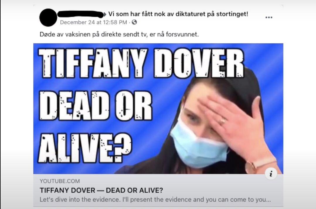 Den amerikanske sykepleieren Tiffany Dover besvimte på TV etter at hun hadde tatt koronavaksine. På sosiale medier går det rykter om at hun er død, men det stemmer ikke. Se videoen fra Faktisk.no.