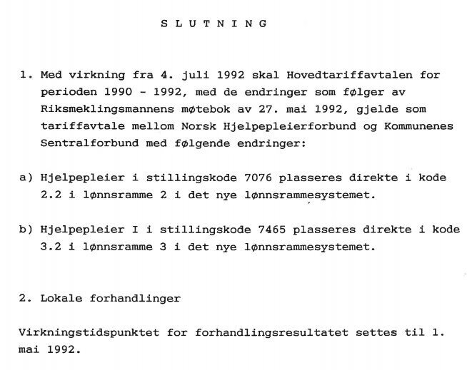 Rikslønnsnemndas flertall ga «uttrykk for forståelse for den irritasjon tilbudet fra KS har vakt i NHF. Det må sies å være uttrykk for en lite smidig holdning når KS presenterer et tilbud som i det ytre klart framtrer som en forverring av den lønnsmessige posisjon for en gruppe arbeidstakere», sitat fra kjennelsen i oktober 1992.