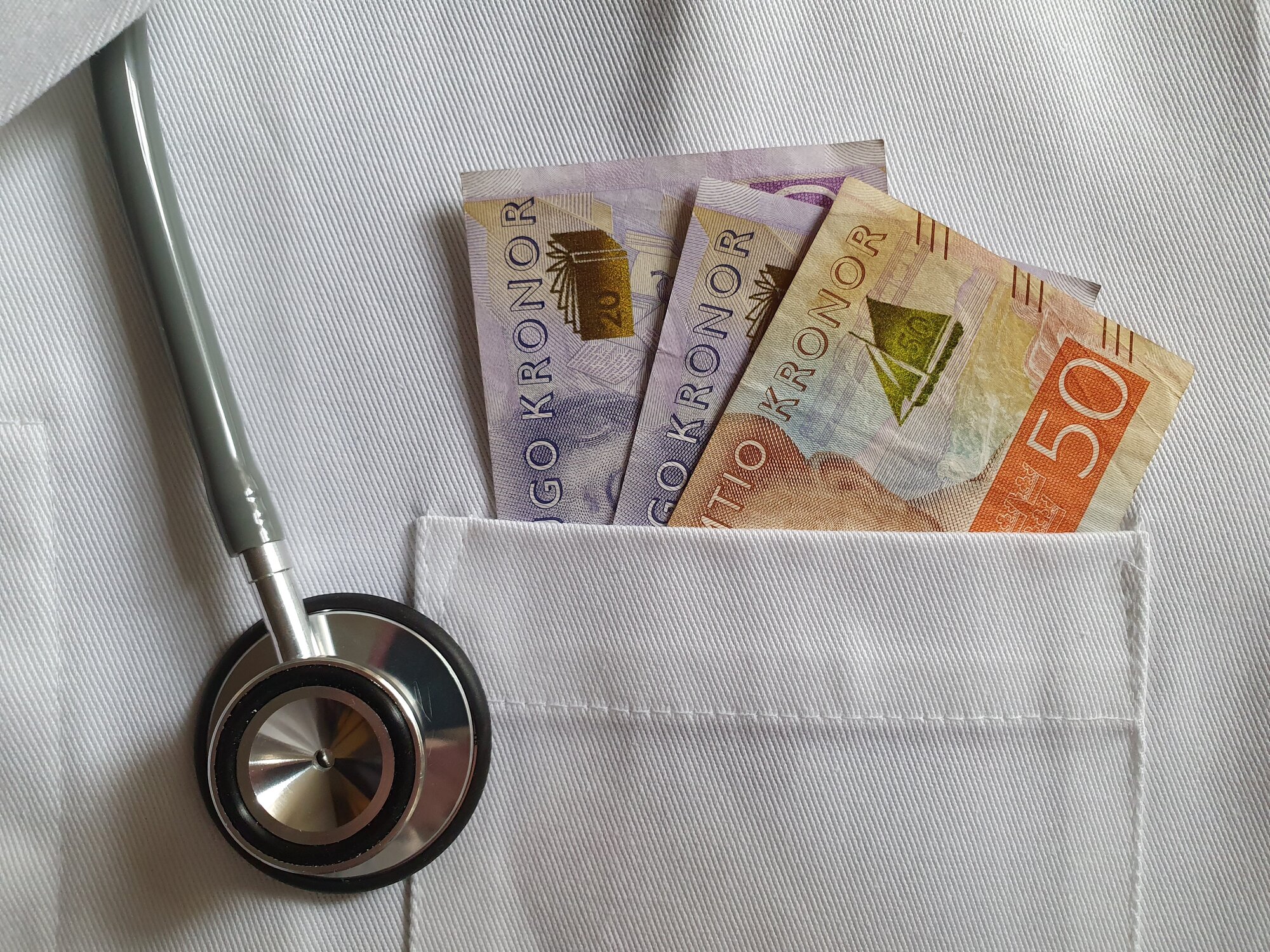 bildet viser en hvit frakkelomme med svenske penger i