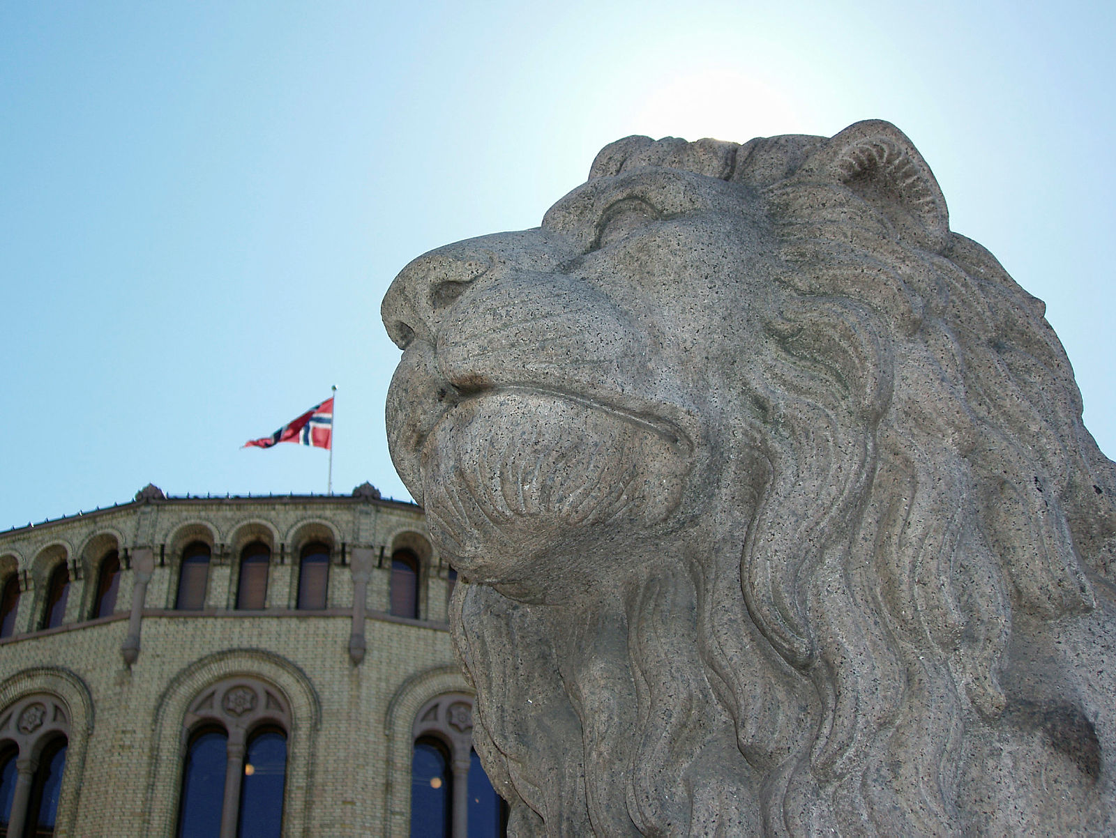 Bildet viser Stortinget og den ene løvestatuen utenfor.