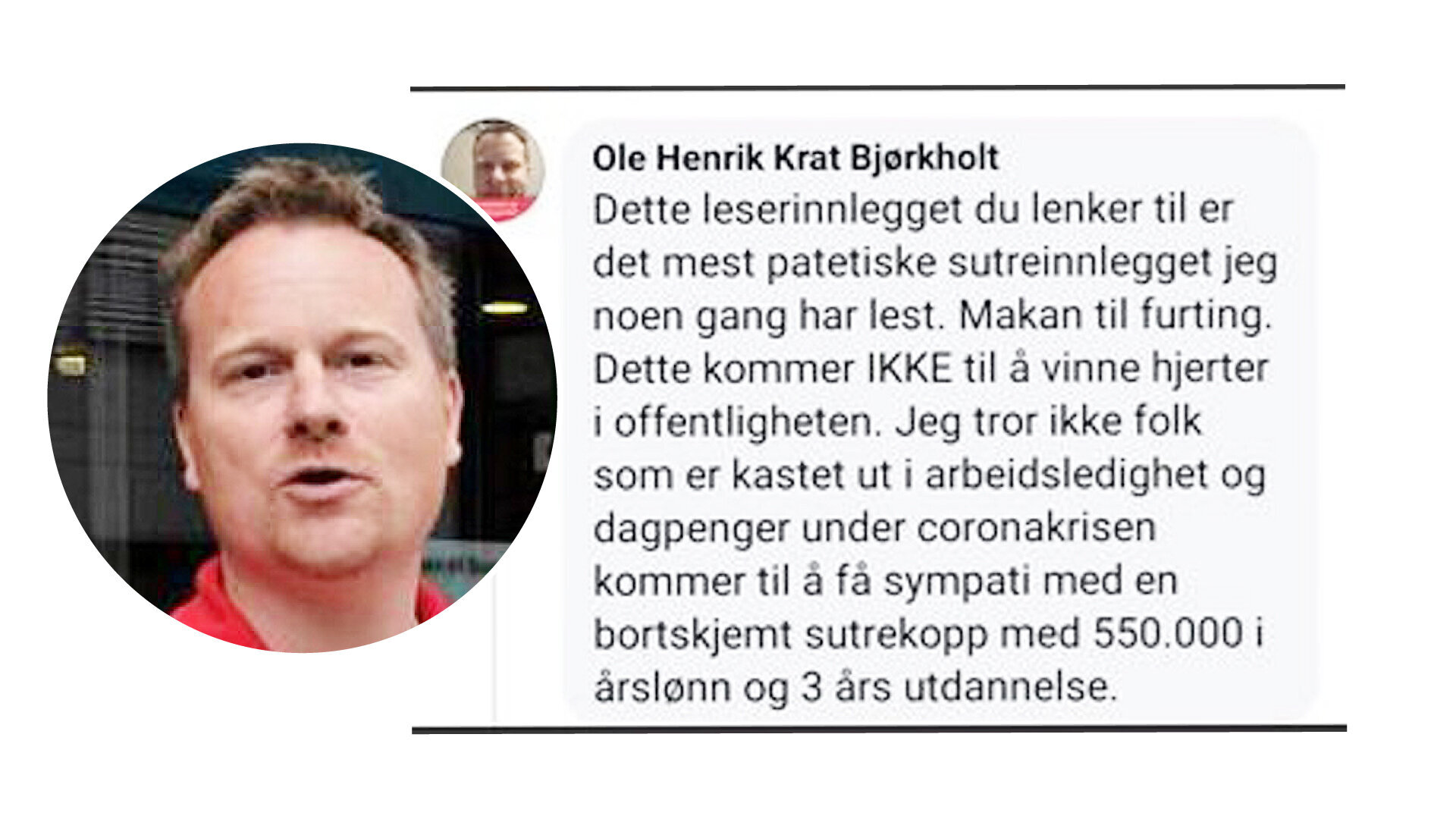 – Dette leserinnlegget du lenker til er det mest patetiske sutreinnlegget jeg noen gang har lest. Makan til furting. Dette kommer ikke til å vinne hjerter i offentligheten. Jeg tror ikke folk som er kastet ut i arbeidsledighet og dagpenger under koronakrisen kommer til å få sympati med en bortskjemt sutrekopp med 550.000 i årslønn og tre års utdannelse.