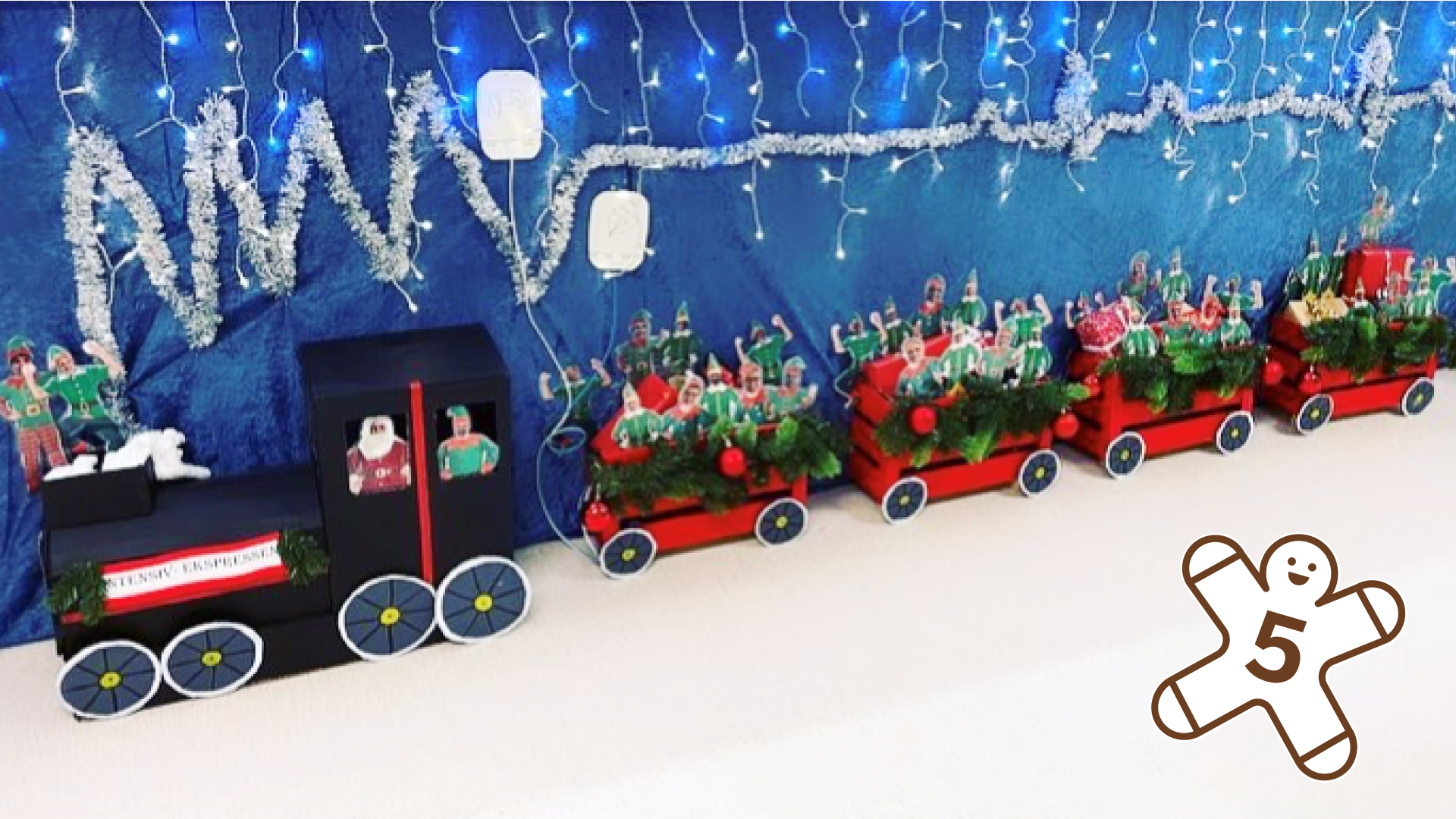 Det er andre gang juletoget har tøffet inn i avdelingen. Nytt av året er at det har fått passasjerer, i hovedsak alver, som har de ansattes ansikter.
