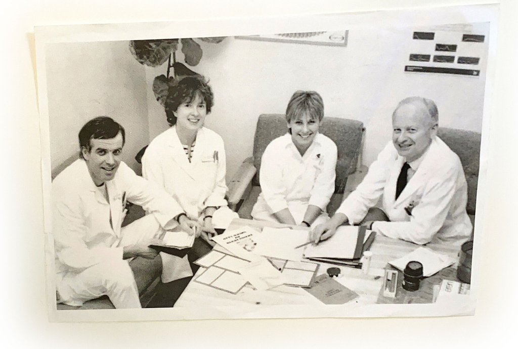 DIABETESTEAM: BIldet er fra poliklinikken tidlig på 80-tallet. Fra venstre: Johannes Kahrs, assisterende lege, Polly Robertson, klinisk ernæringsfysiolog, Birgit  Marthinsen, ­diabetessykepleier og lege Torbjørn Gjemdal.   Foto: Privat