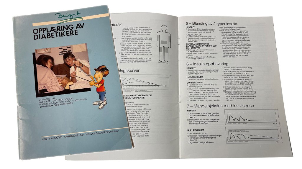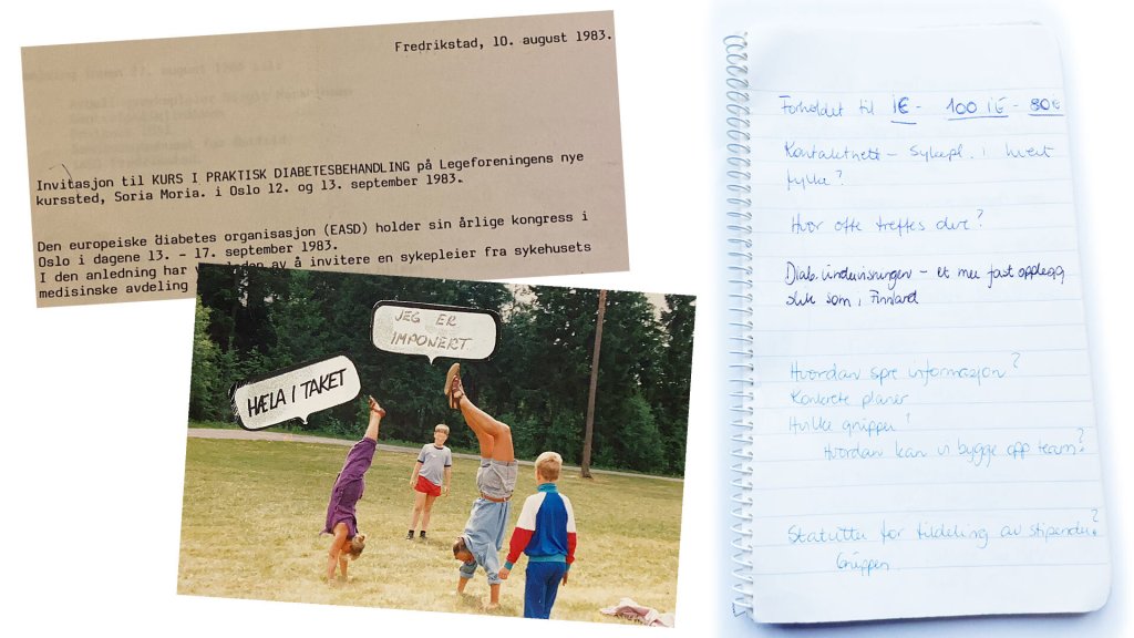 I 1982 kom heftet «mat og diabetes», forteller Marthinsen, mens hun leter gjennom bunken av alt hun har tatt vare på fra disse første, viktige årene. Heftet var laget av to ernæringsfysiologer fra Aker sykehus og Aase Skaar, som var oversykepleier på barneavdelingen ved Tønsberg sykehus.