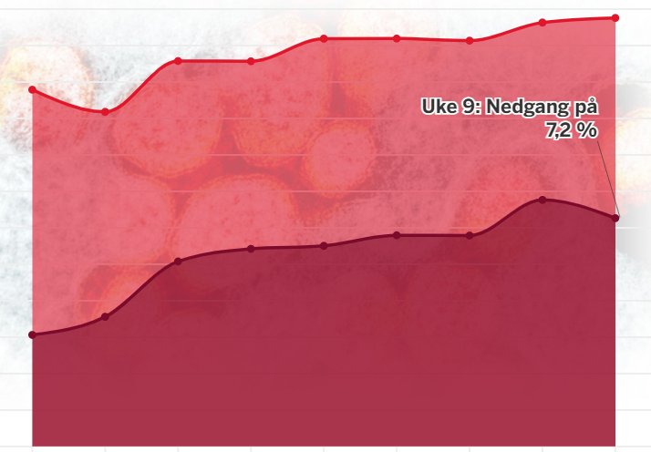 31 300 personer av de ble sykmeldt med korona forrige uke, en nedgang på 2500, eller ned 7,2 prosent fra uke 8.