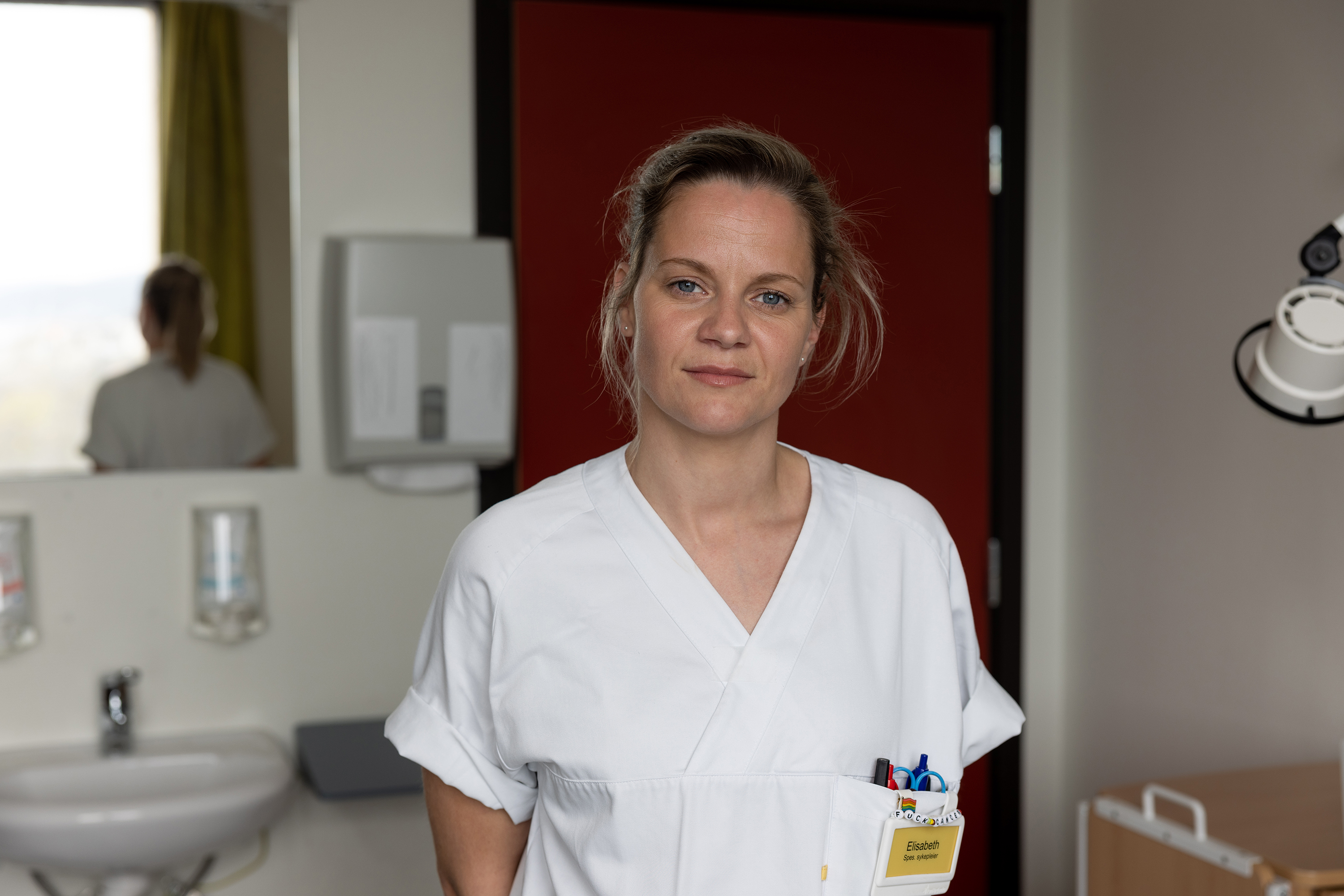 – Fordelen her er at det er vindu i døra. Så når vi var i slusen, kunne vi egentlig kommunisere med pasienten gjennom vinduet. Eller se til at vedkommende har det bra. Det sparte vi tid på, siden vi ikke måtte skifte smittedrakt når vi ikke trengte å gå inn.
