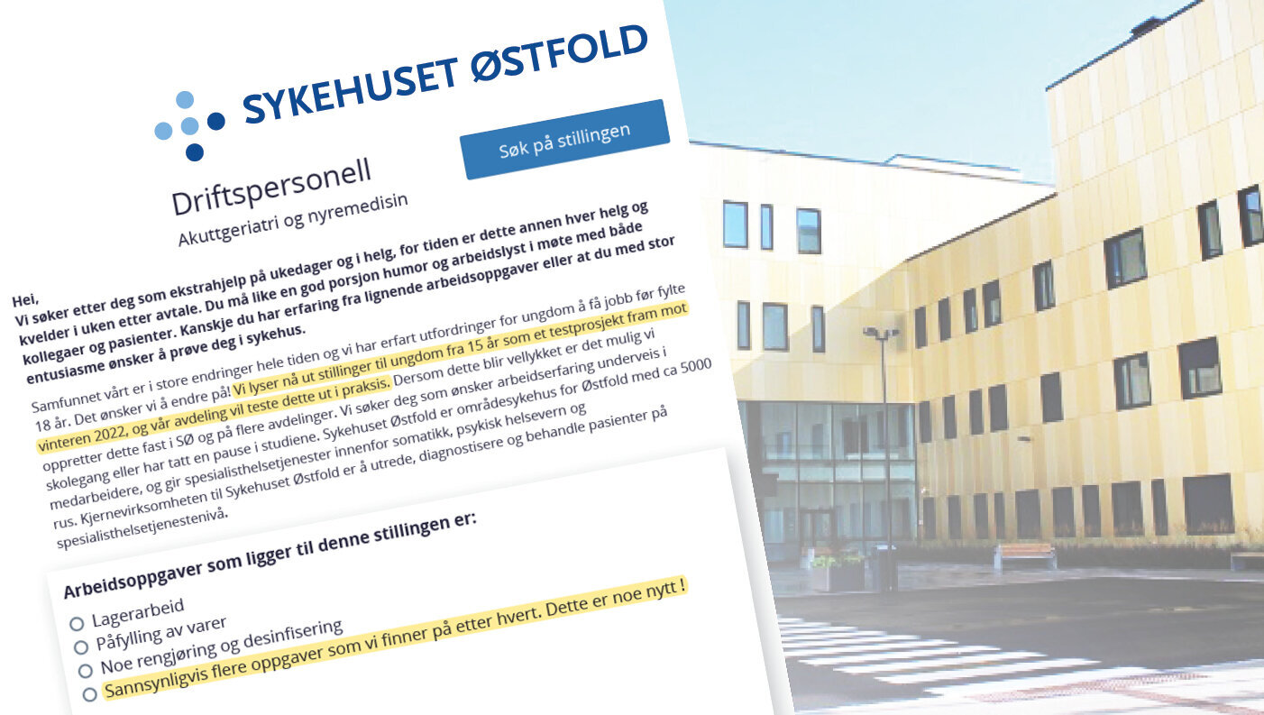 Sykehusledelsen ved Sykehuset Østfold har rekruttert og ansatt 15- og 16-åringer for å jobbe som driftspersonell på geriatrisk døgnpost.