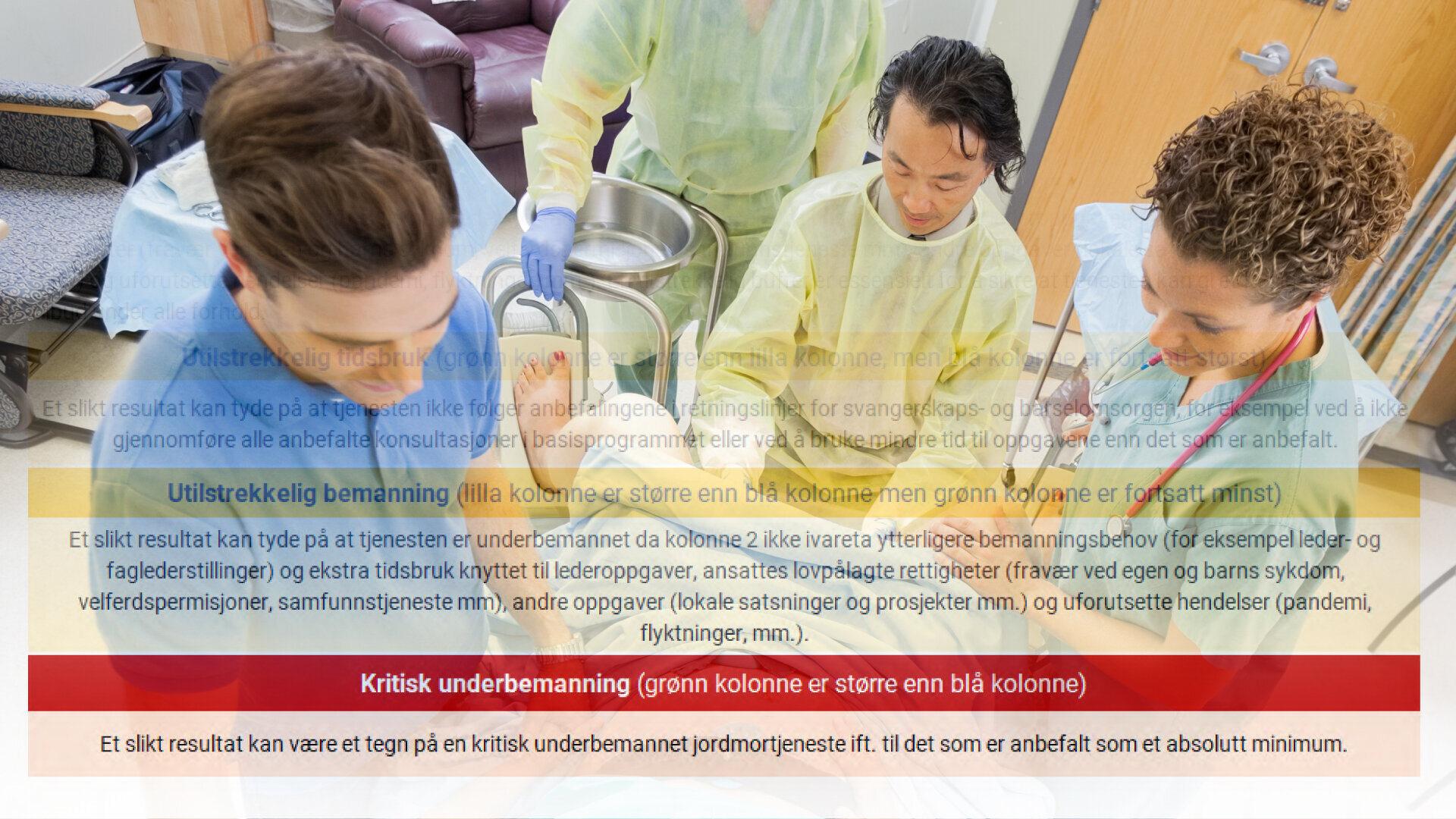 Ved å legge inn blant annet antall jordmødre i kommunehelsetjenesten, antall fødsler, stillingsprosent og så videre, kommer det en «fasit» som viser om kommunen er under- eller eventuelt overbemannet i jordmortjenesten.