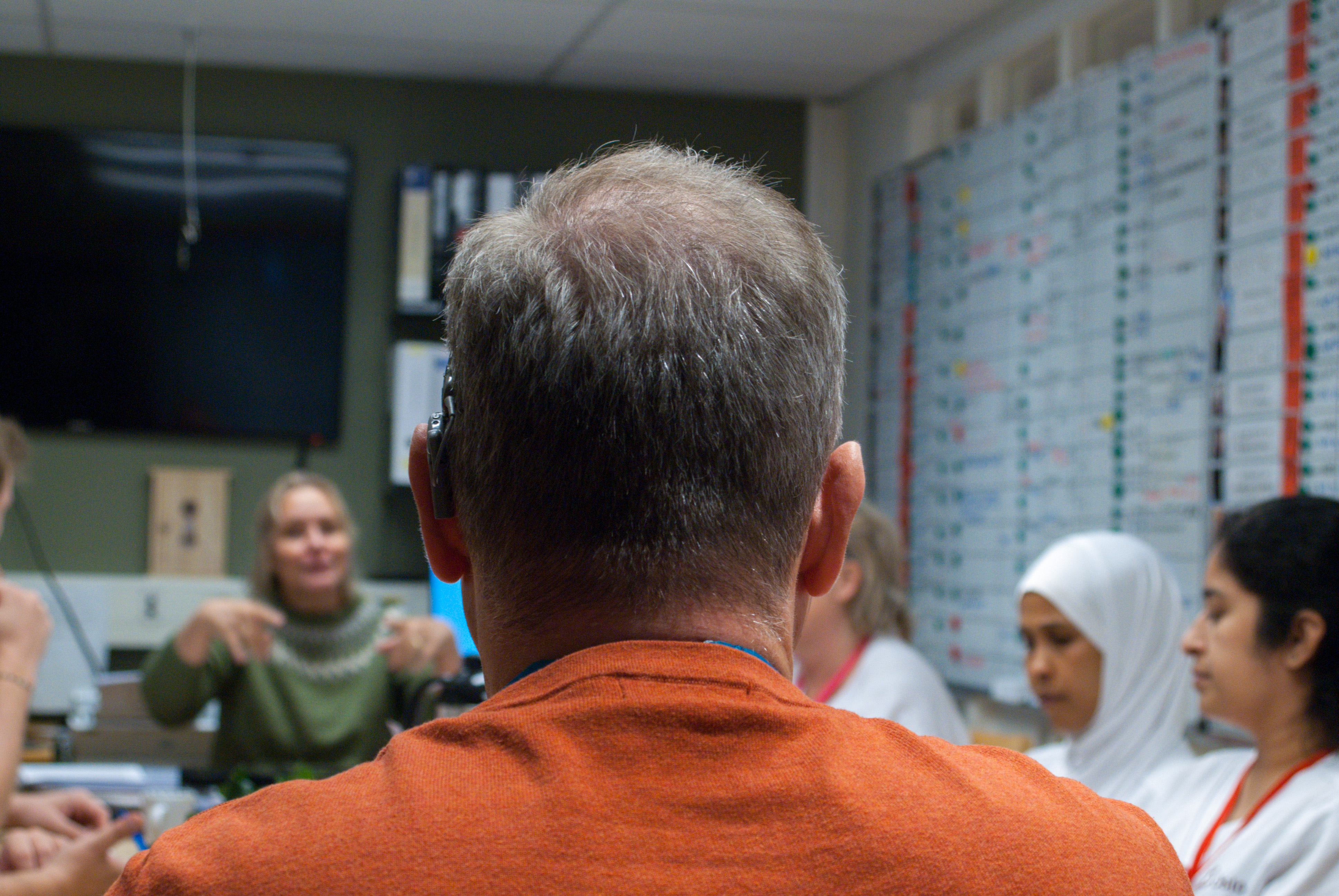 Fra den ene bordenden styrer avdelingsleder og sykepleier Tom Harald Isakka-Dahl møtet effektivt og rutinert.