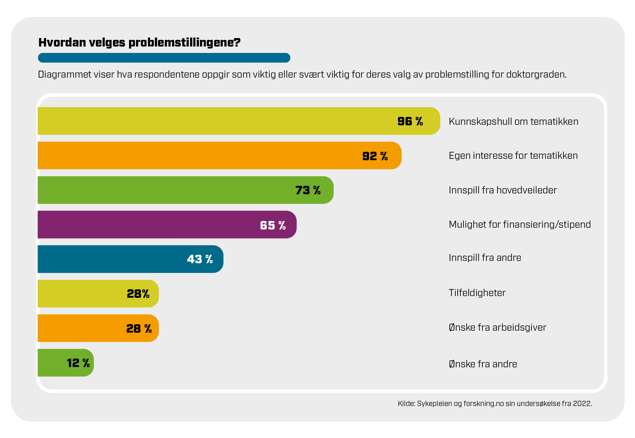 Når det gjelder valg av problemstillinger for avhandlingene, oppgir sykepleierne oftest at de er motivert av kunnskapshull og egen interesse for tematikken. Begge disse faktorene vurderes som svært viktig for rundt 6 av 10 respondenter.