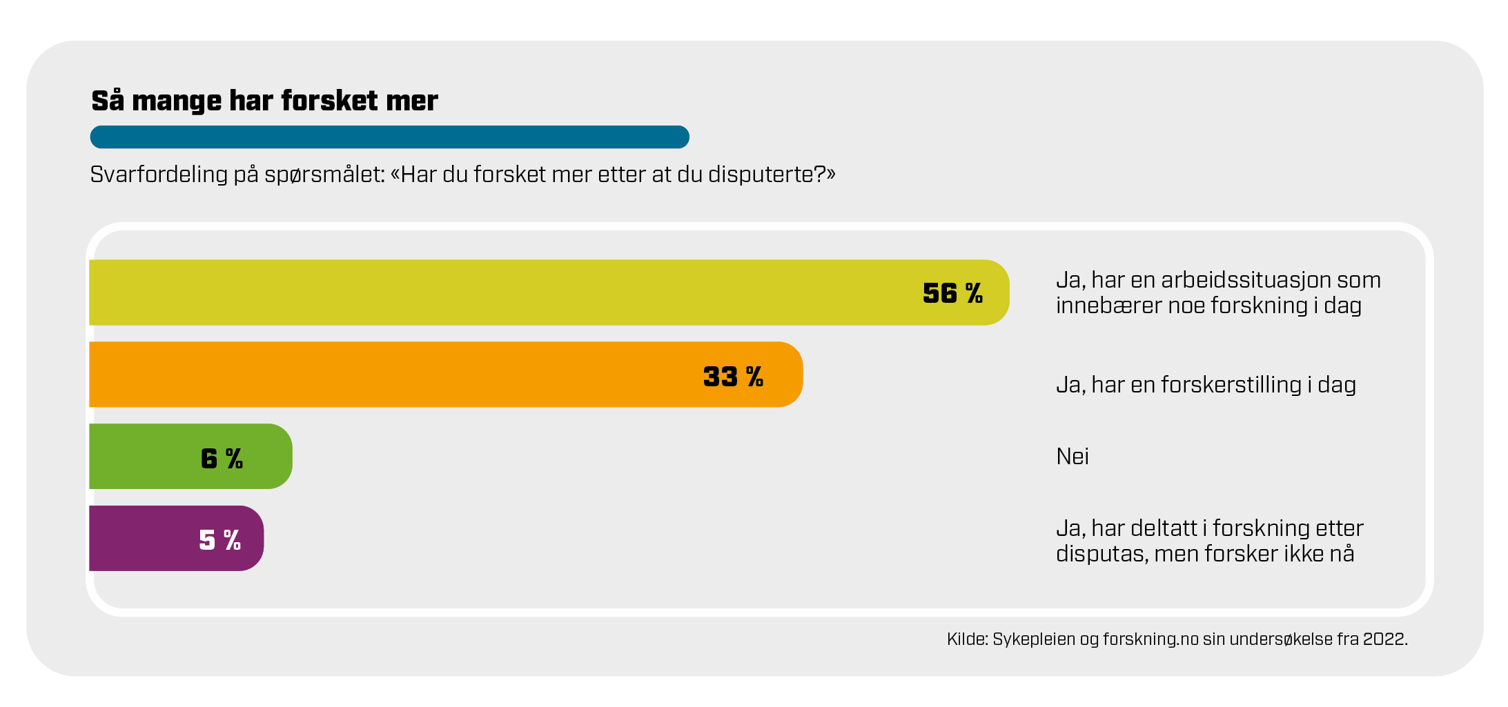 Et stort flertall av deltakerne i undersøkelsen oppgir at de har forsket mer etter fullført disputas. 33 prosent oppgir å ha en forskerstilling i dag, mens 56 prosent sier de har en arbeidssituasjon som innebærer noe forskning.