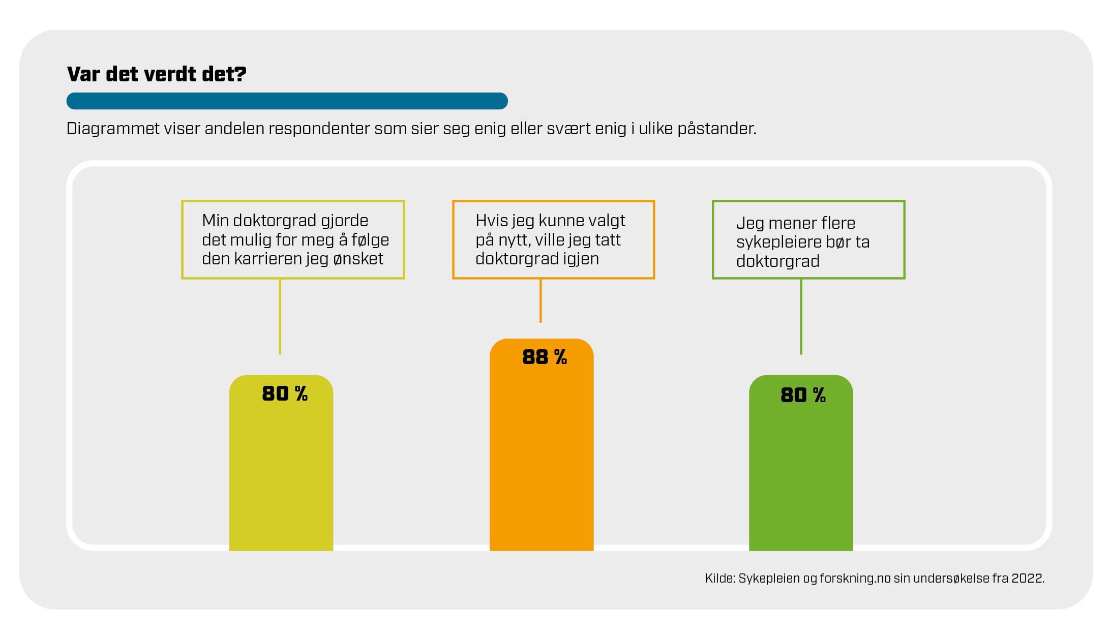 Med tanke på alt som skrives om frustrerende lønnsnivå, tøffe turnuser, underbemanning og belastningsskader, kunne man kanskje tenke seg at en del så doktorgraden som en vei vekk fra sykepleieryrkets mindre attraktive sider.