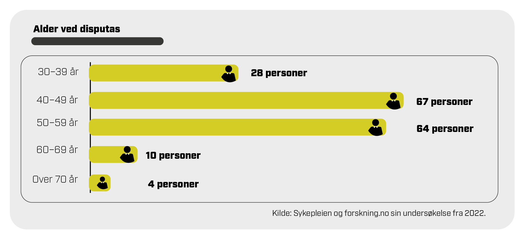 Sykepleiere er gjerne godt voksne og erfarne når de tar sin doktorgrad. I snitt var deltakerne i undersøkelsen 48,2 år ved disputasen. Dette er rundt ti år over landsgjennomsnittet for alle doktorander, ifølge tall fra Nordisk institutt for studier av innovasjon, forskning og utdanning (Nifu).
