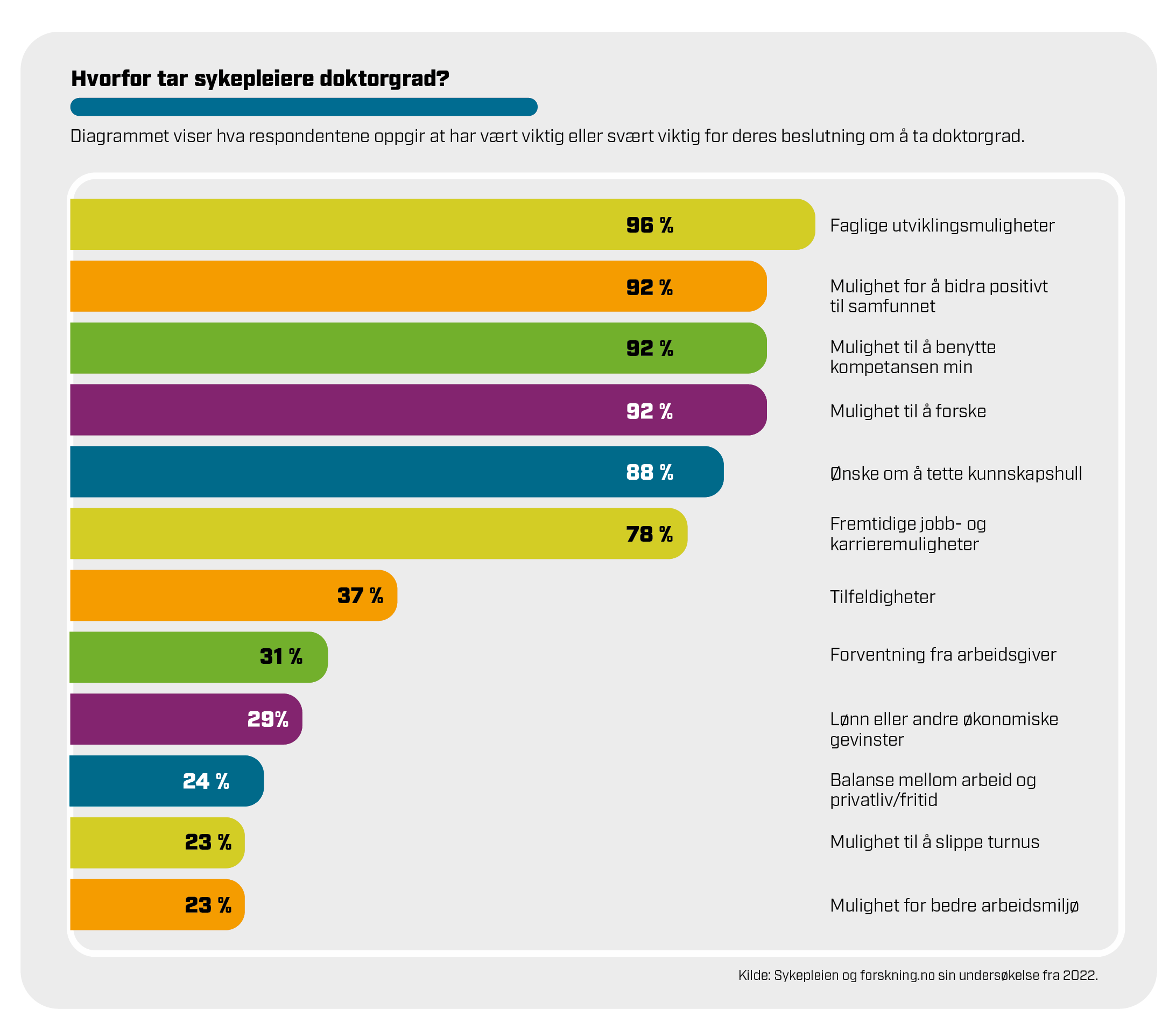 Svarene indikerer derimot at den viktigste motivasjonen for sykepleiere til å ta doktorgrad er faglige utviklingsmuligheter. Hele 77,5 prosent oppgir at dette var svært viktig for deres beslutning.
