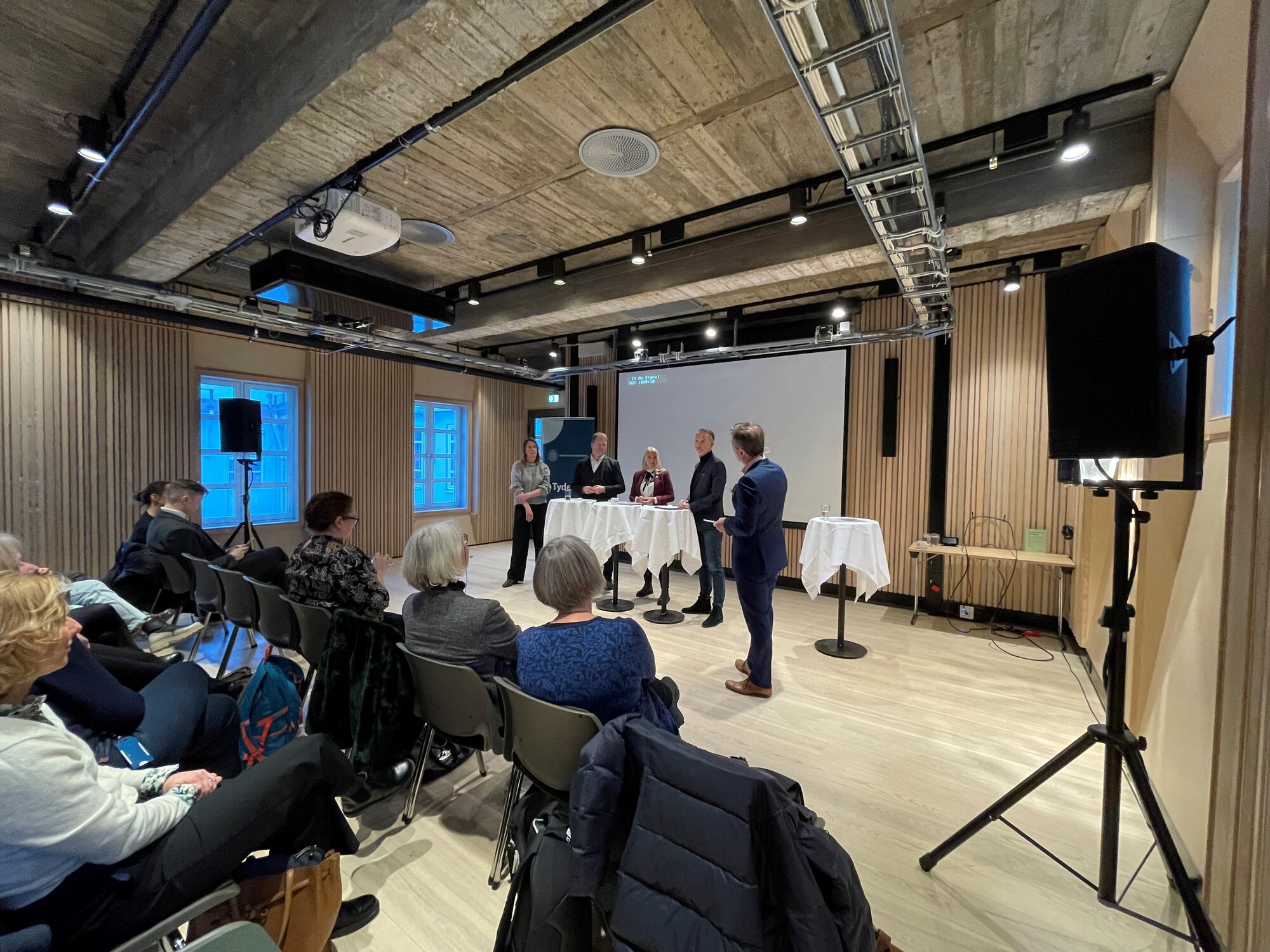 For å debattere løsningene møtte altså kommunal- og distriktsministeren, direktør for arbeidsliv i KS, Tor Arne Gangsø, forbundsleder i NSF, Lill Sverresdatter Larsen, og Camilla Børresen, som er enhetsleder for Kvaløya hjemmetjenester i Tromsø kommune. Håkon Haugsbø ledet paneldebatten.