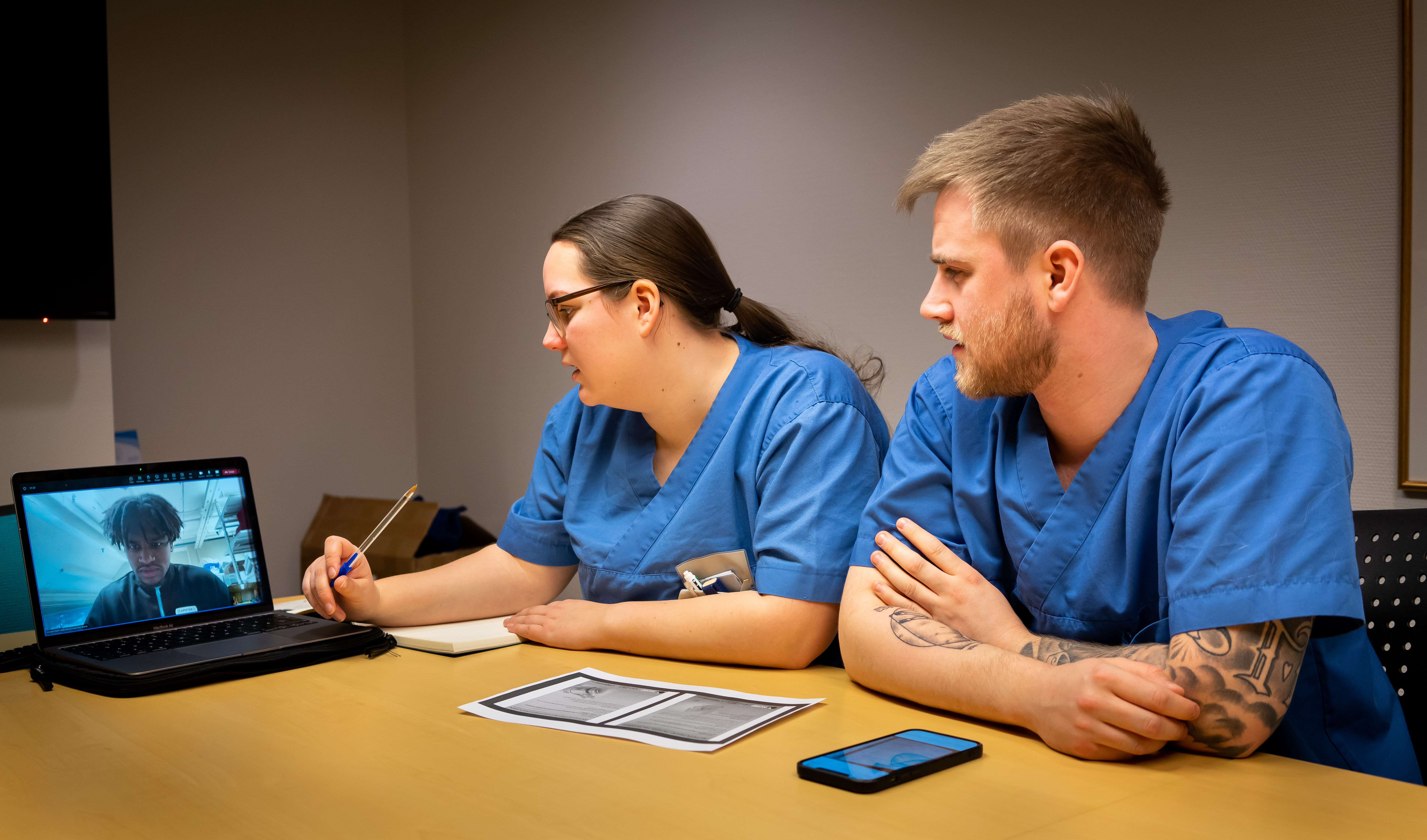 Dette møtet er en del av praksis for alle de tre studentene. I et hjørne sitter Modells basisveileder, Camilla Nordhøy, og observerer.