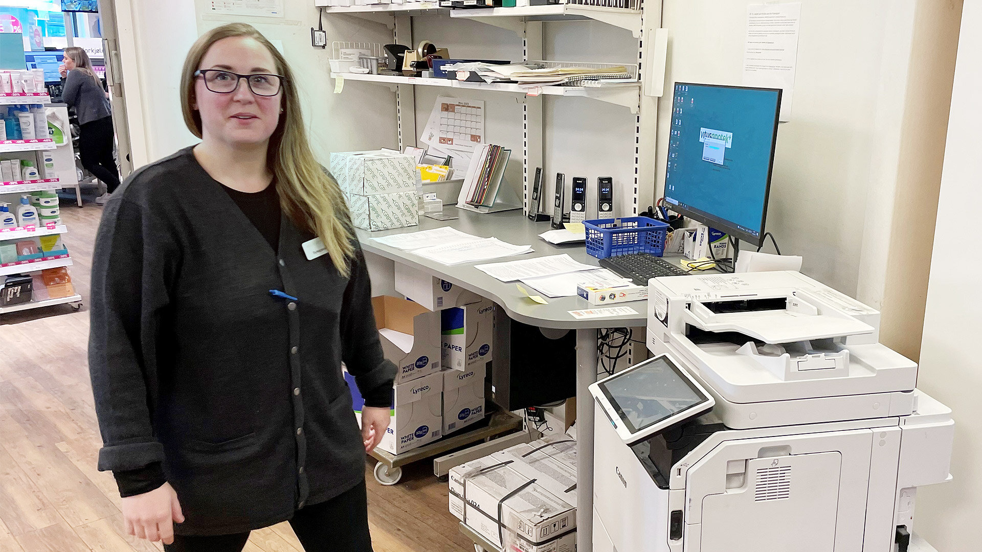 Sykepleier Camilla Aaland Krokaas jobber på et av Oslos døgnåpne apotek, hvor veterinærene inntil forrige uke fikk sende inn resepter på telefaks.