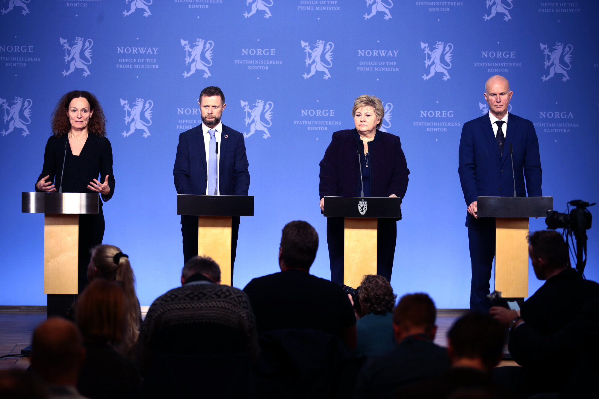 Bildet viser pressekonferansen da pandemien stengte Norge ned 12. mars 2020