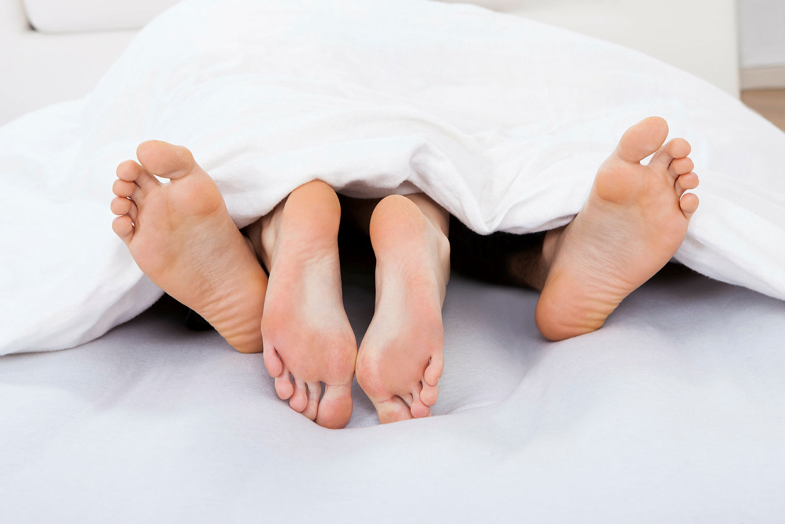Bildet viser to par ben som stikker frem fra under en dyne.