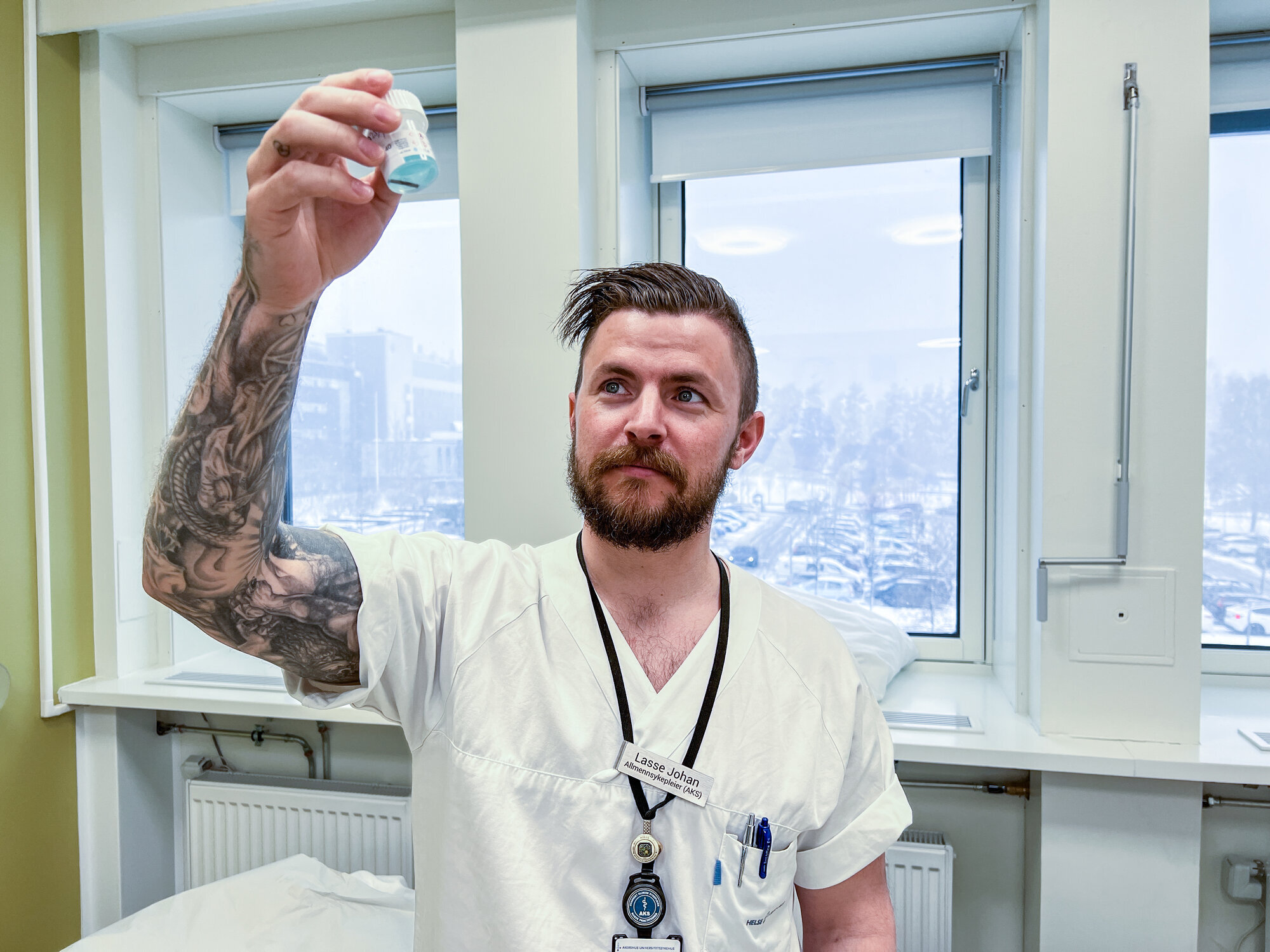 Thue skal ta en benmargsprøve, som tas i utredning av ulike blodsykdommer. Tradisjonelt tas den av en lege. Men på Akershus universitetssykehus (Ahus) er det han som gjør det. Som AKS er han spesialutdannet til å gjøre kliniske undersøkelser og jobbe selvstendig.