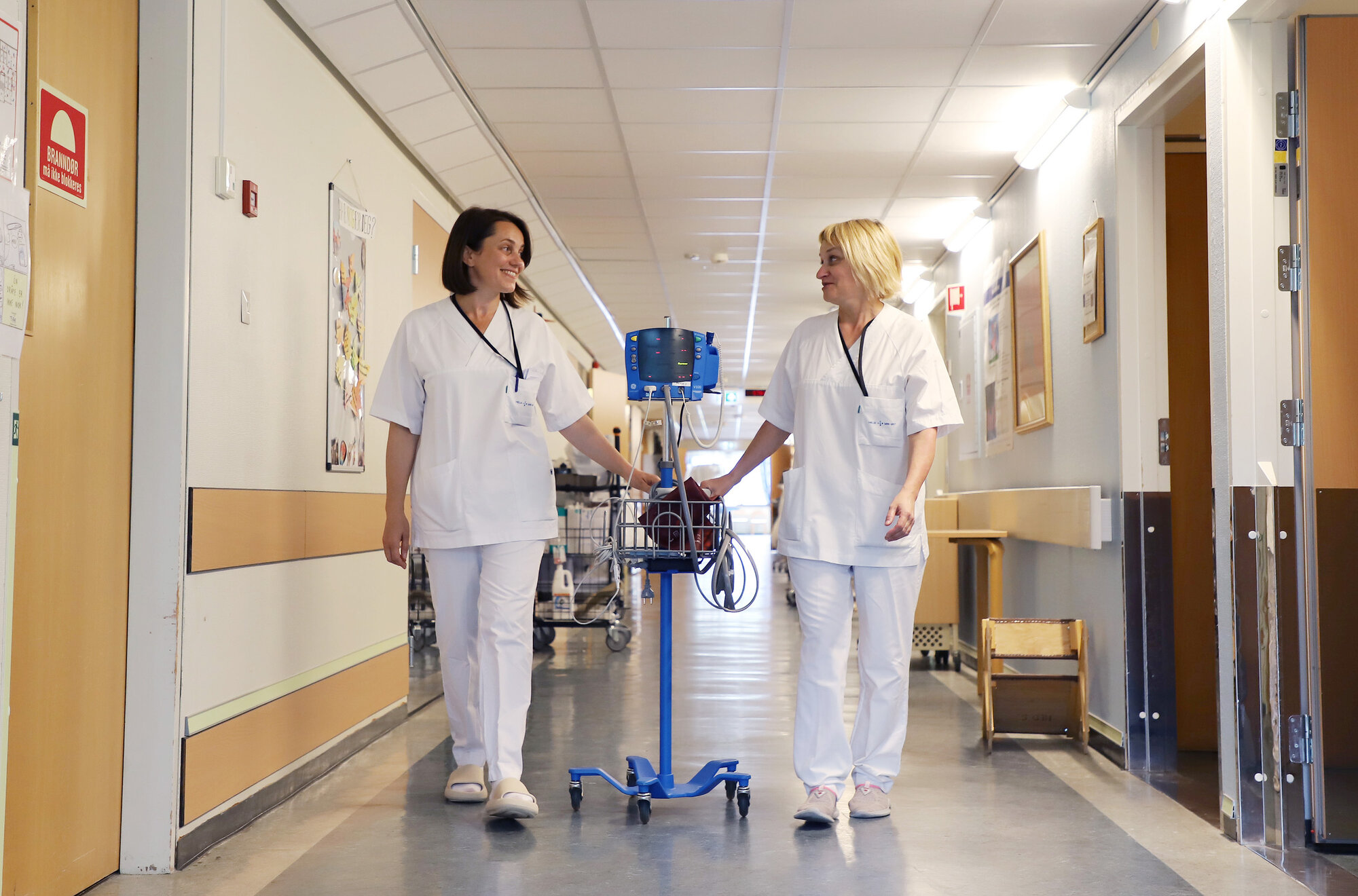 I gangene på medisinsk sengepost 2 på Ahus Kongsvinger sykehus måler sykepleieren Svitlana Yakymenko og laboratorieteknikeren Olga Bondarchuk alt fra blodtrykk til blodsukker, triller senger og steller med pasientene.