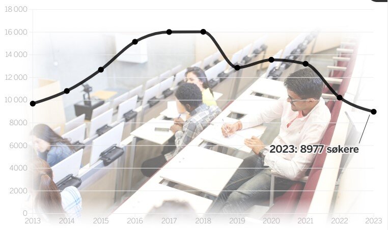 Det var 10 223 førstevalgsøkere i fjor, mens antallet i år er redusert til 8977 førstevalgsøkere.