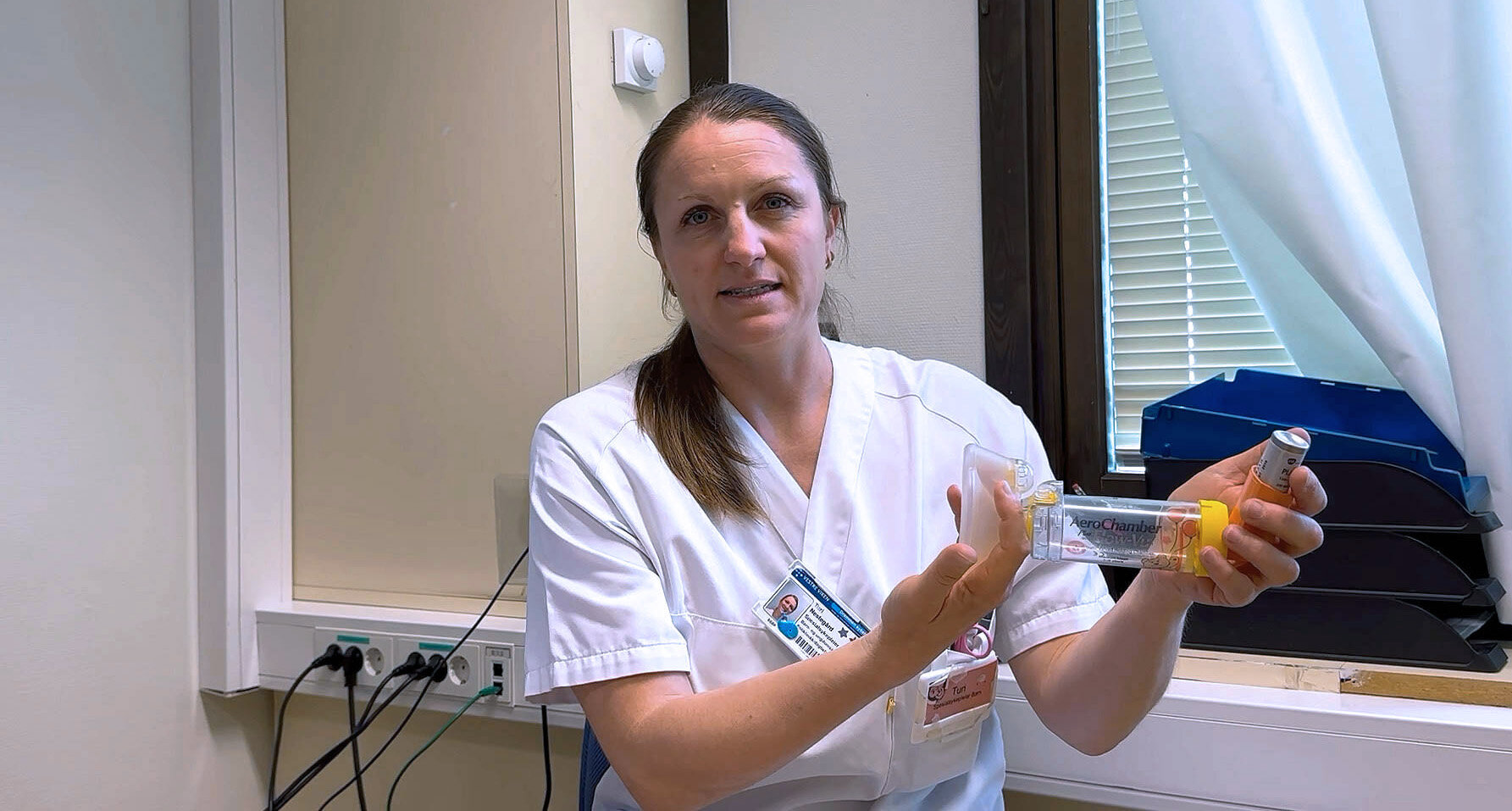 I videoen under viser Nestegård hvordan astmamedisin skal tas med inhalasjonskolbe.