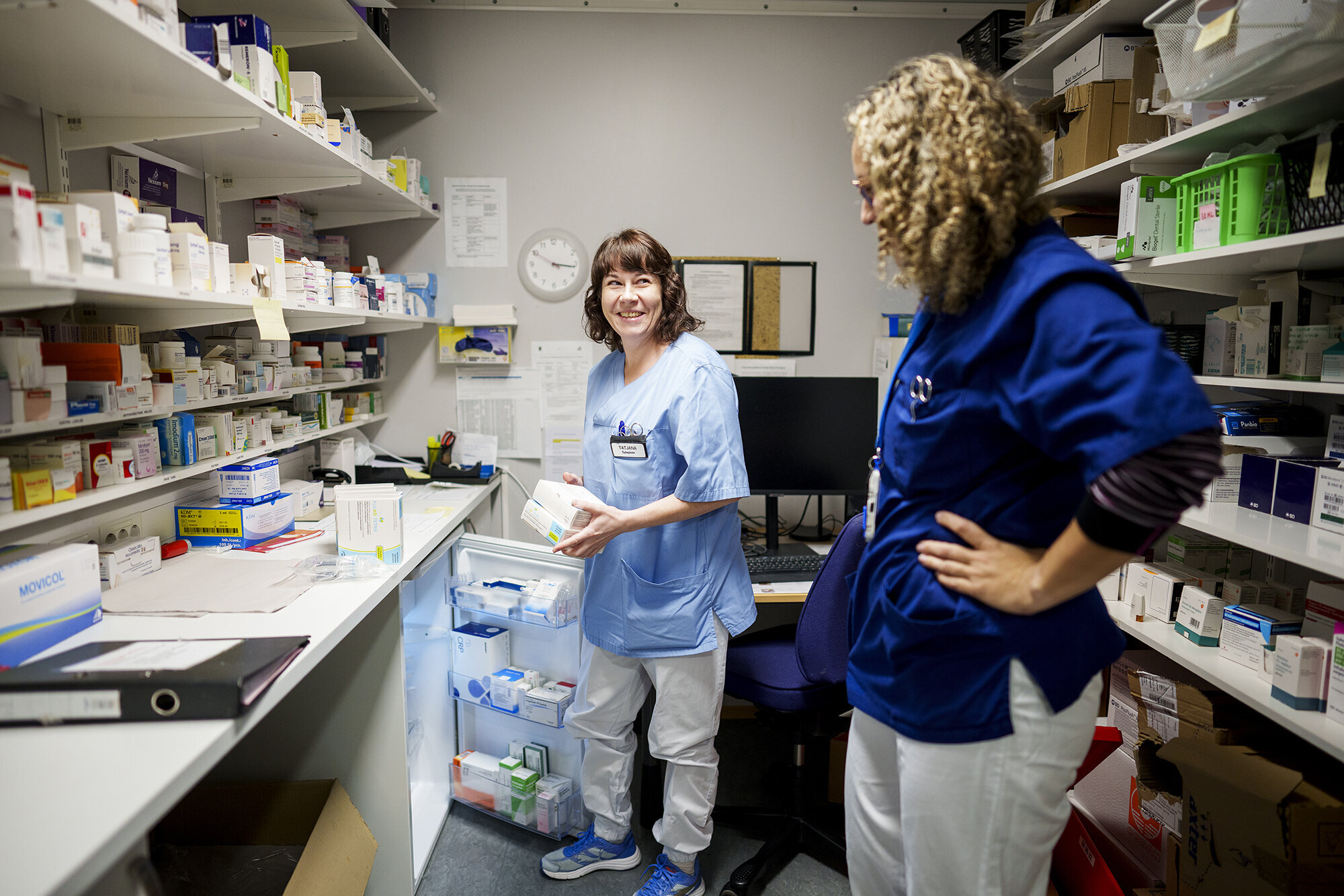 Influensasesongen står for tur også ved Munkvoll helse- og velferdssenter. Sammen med sykepleier Tatjana Sunde, som akkurat har kommet på kveldsvakt, går Silva gjennom bestillingen for å dobbeltsjekke at de har fått med alt i leveringen.