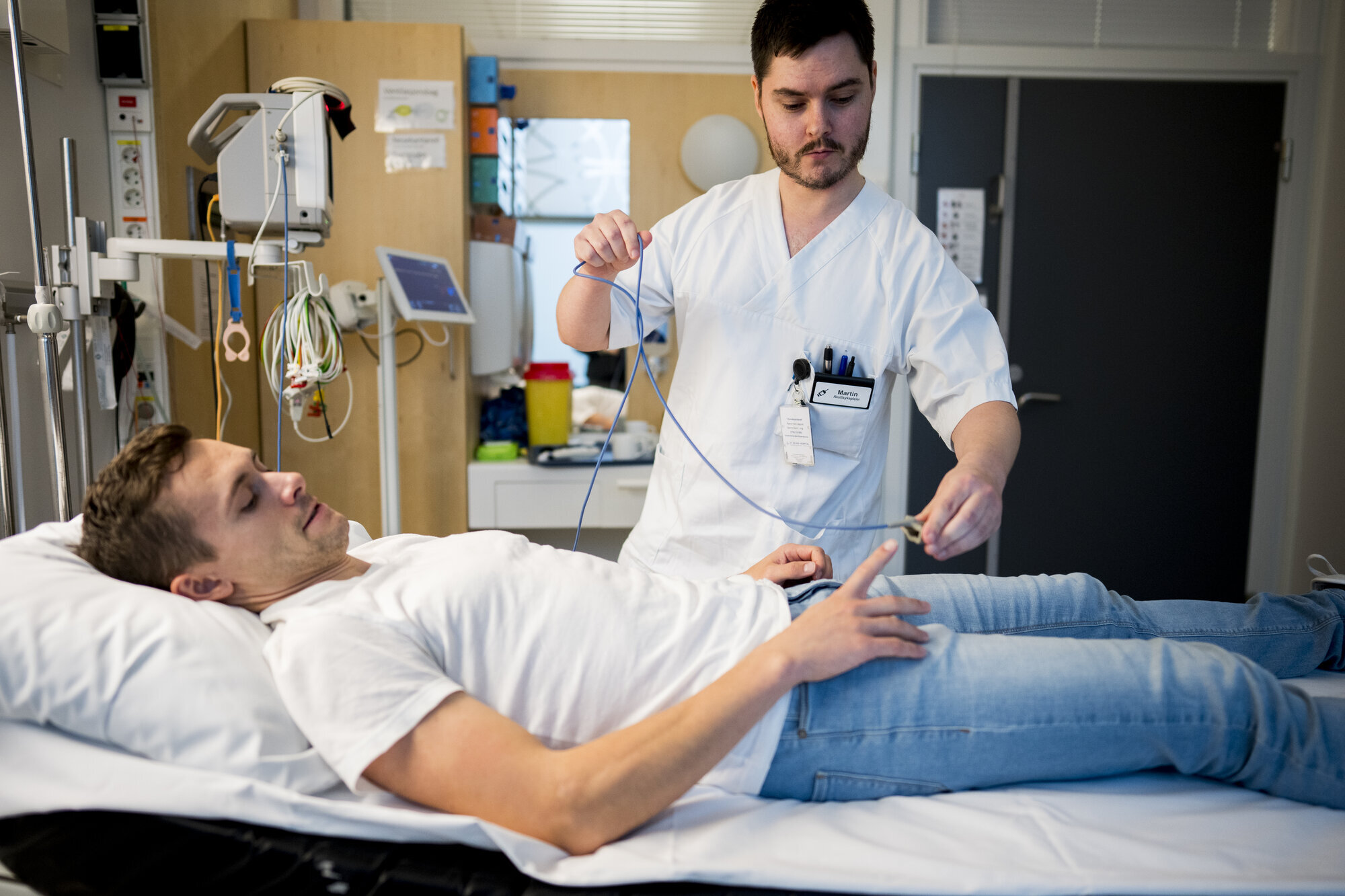 Han svinger inn på et pasientrom. Der ligger en helt frisk mann som har blitt innkalt som testperson.