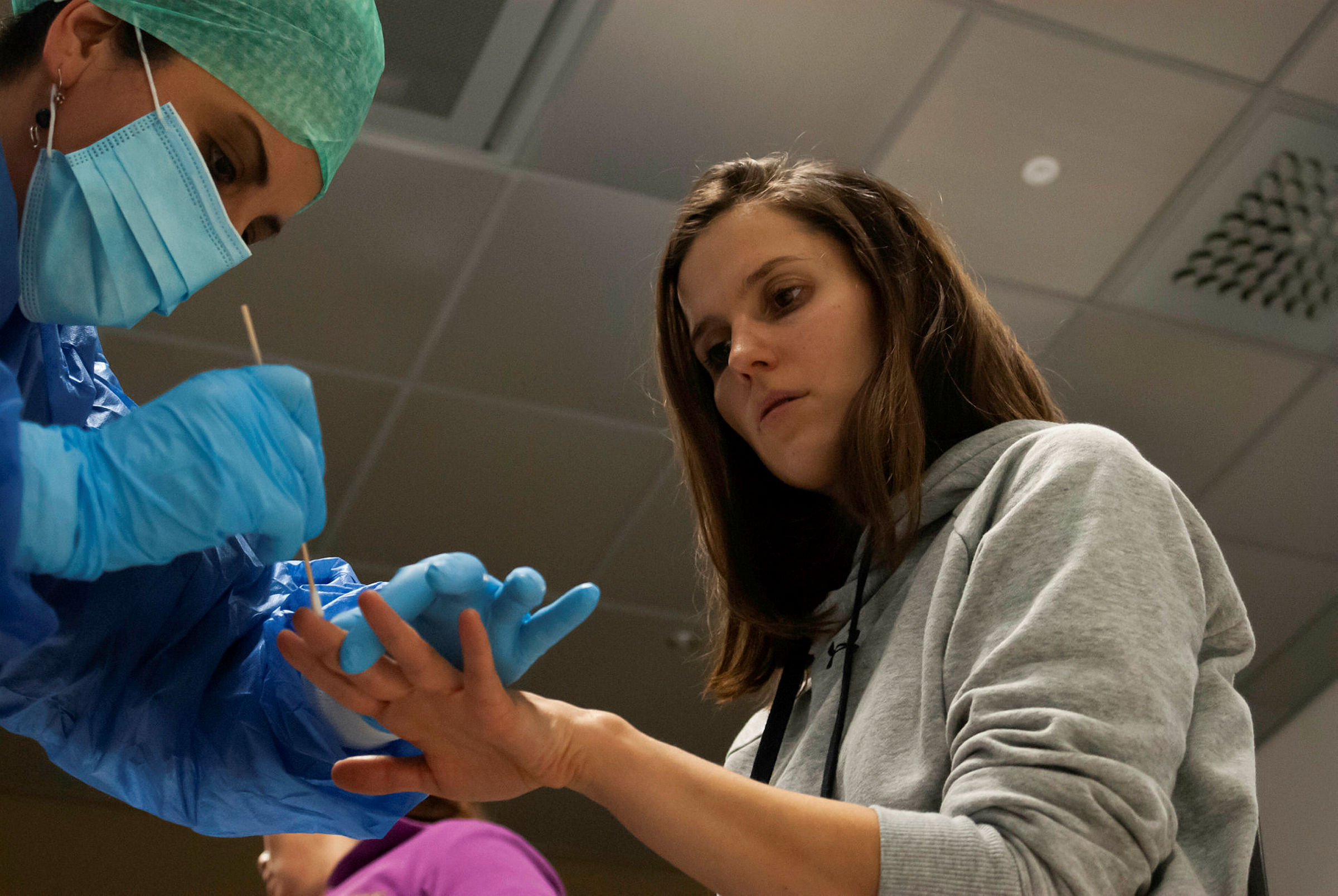 BERGEN (Sykepleien): Madeleine Svendsen sitter på en stol og gaper. Foran henne står en kvinne godt tildekket med munnbind, hansker, operasjonshette og smittefrakk. Hun fører en vattpinne grundig rundt i den åpne munnen.